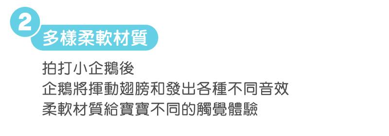 • 小朋友拍打小企鵝後,企鵝將揮動翅膀和發出各種不同音效。