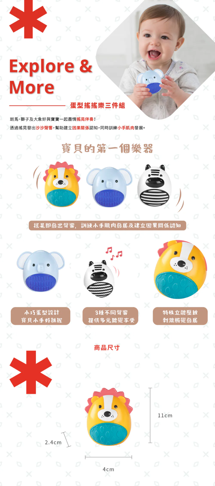 斑馬、獅子及大象好朋友,與寶寶一起盡情搖晃伴奏!透過搖晃發出沙沙聲響,幫助建立因果關係認知,同時訓練小手肌肉發展。