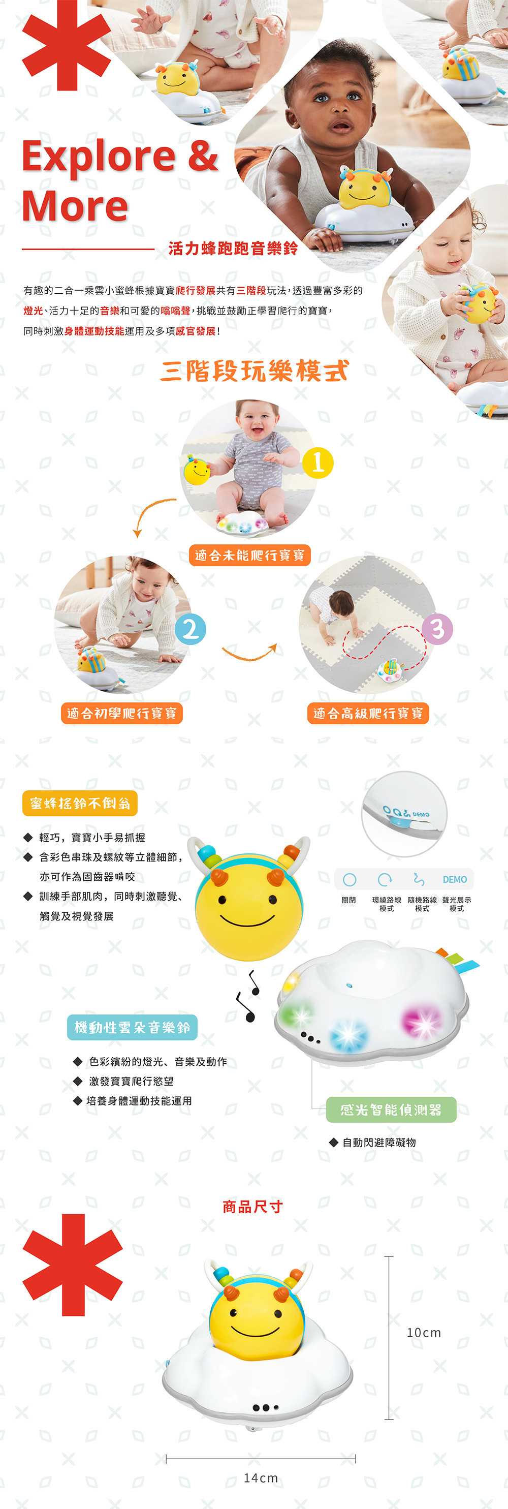 -2合1 (雲朵音樂鈴+蜜蜂搖鈴不倒翁)透過豐富多彩的燈光、音樂及動作鼓勵爬行。