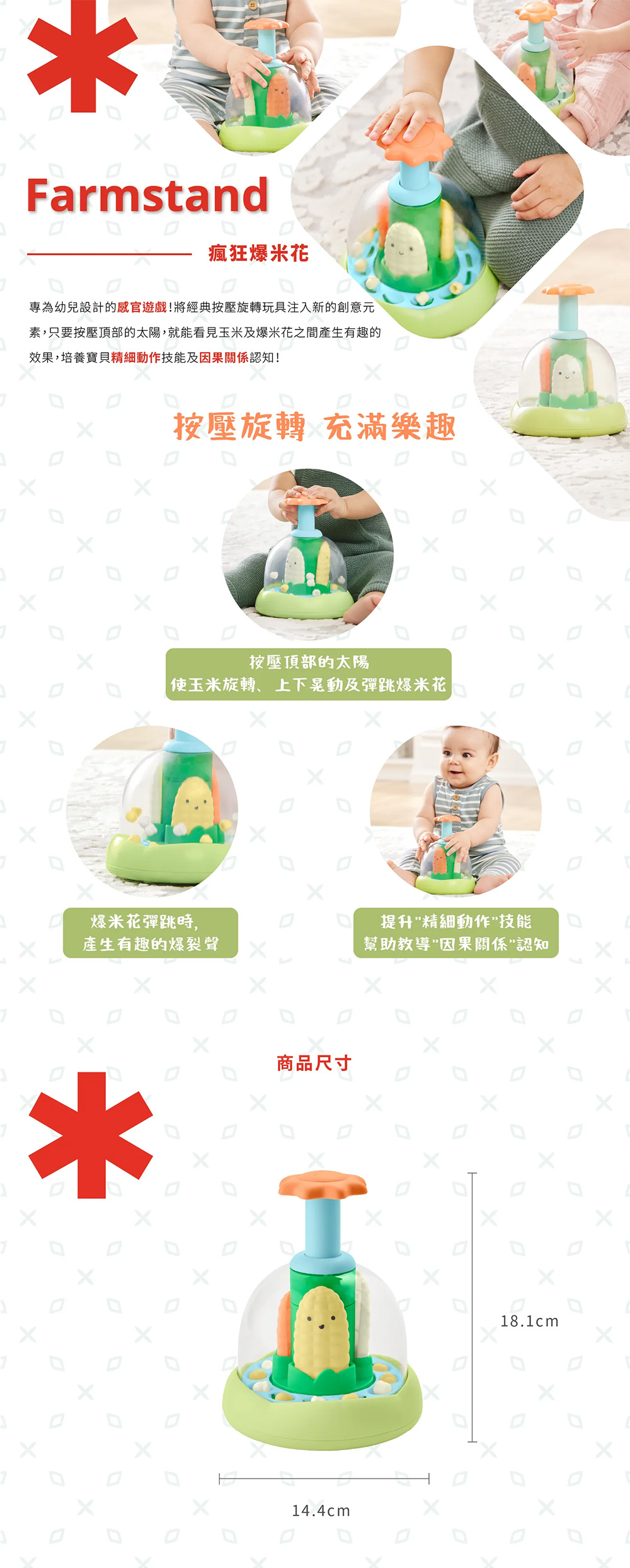 -按壓頂部的太陽,使玉米旋轉、上下晃動及彈跳爆米花