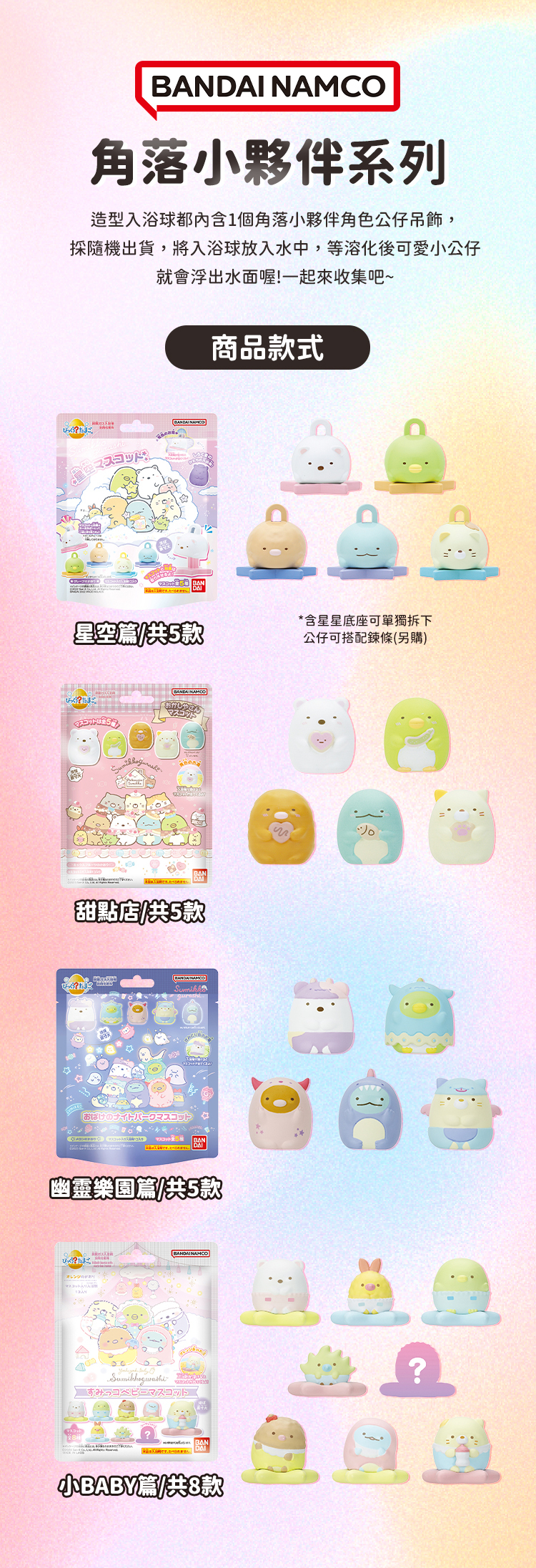 角落小夥伴造型入浴球,每個都內含1個角落小夥伴角色公仔吊飾(含星星底座),可單獨拆下,共5種,採隨機出貨!將入浴球放入水中,等溶化後小公仔就會浮出水面喔! 會出現哪個呢? 公仔可搭配鏈條(另購),就變成可愛吊飾!等您來收集,超可愛呢! 香氣:葡萄香味
