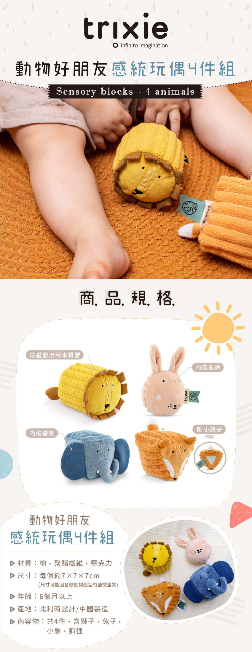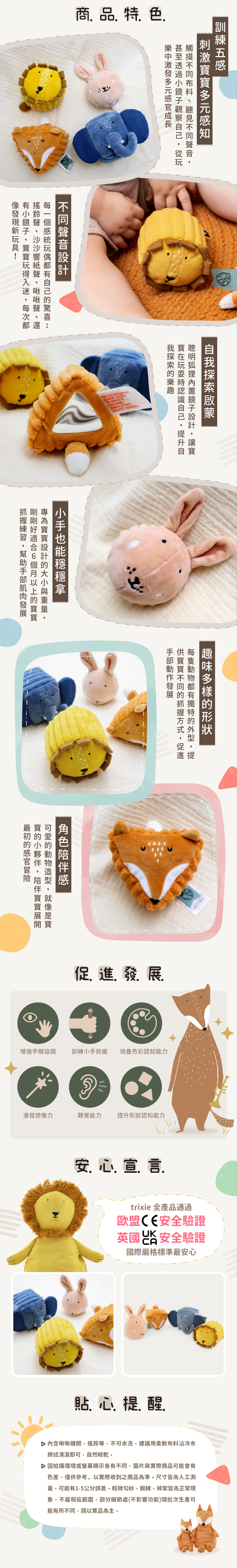 ● 動物皆由不同布料製成,提供孩子多元觸感