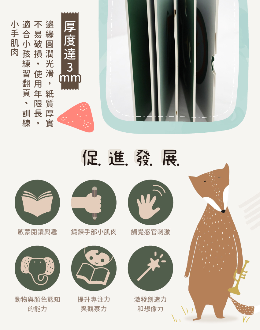 -厚度達3mm,圓潤邊緣,適合小手翻頁