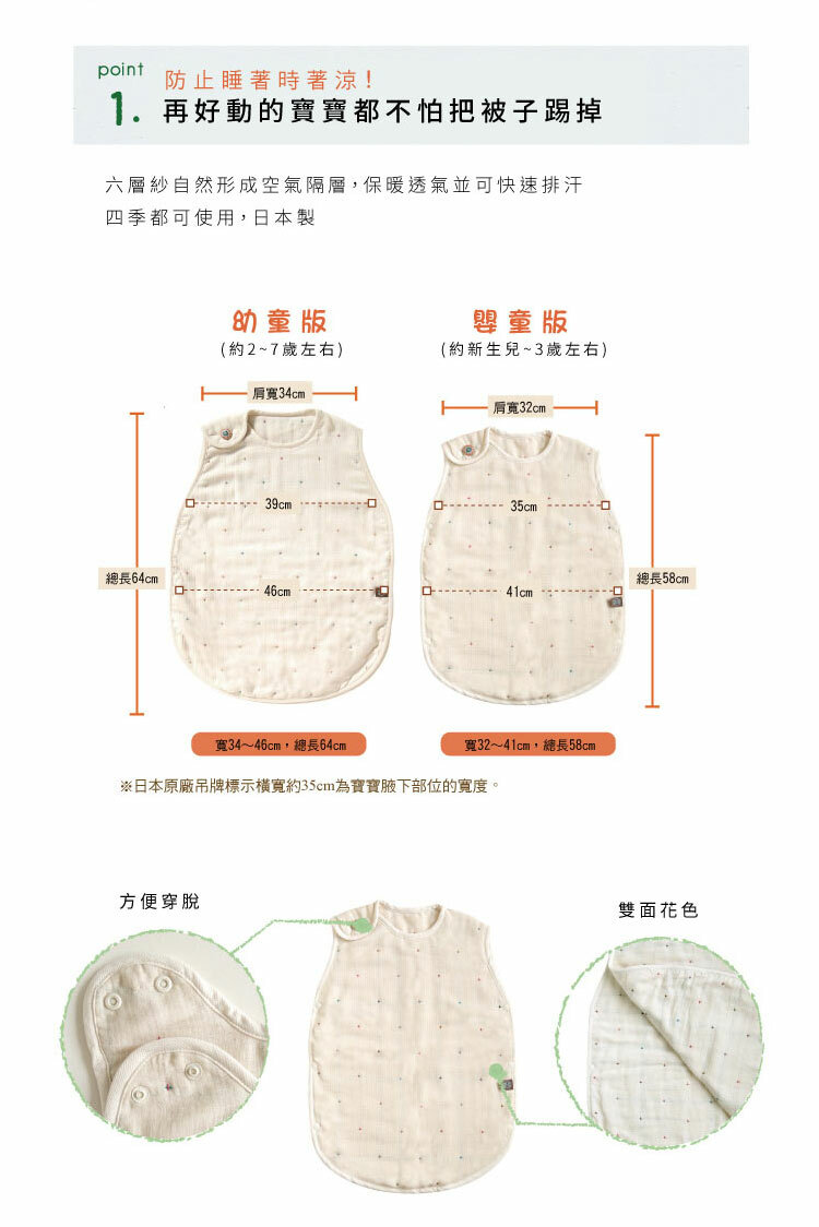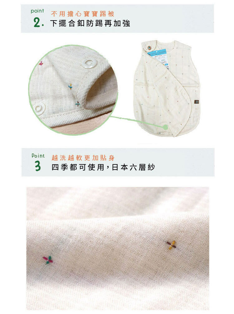 BOBO的繽紛設計,就像穿了一個夢睡覺。透氣性,吸濕性極佳,一年四季都可使用。經過預縮加工,凹凸部分自然形成空氣隔層,冷時保暖不悶熱,熱時透氣並可快速吸汗排氣。最適合濕氣重的台灣亞熱帶氣候。100%天然純棉手感,越洗越軟更加貼身,是對敏感嬰兒最好的素材。輕輕柔柔的存在感,就像媽媽無微不至的關愛。 ※使用洗衣機時請置入洗衣袋再洗滌