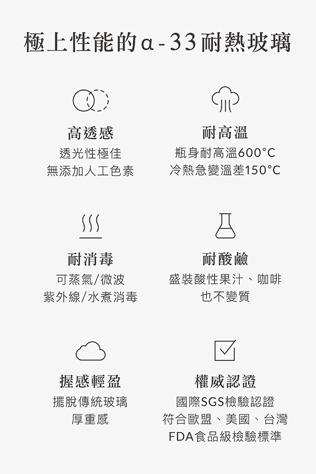 嚴選頂級α-33耐熱玻璃,不含雙酚A&S、塑化劑,耐高溫600˚C。