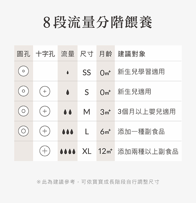 支援新生兒成長階段,容量、奶嘴尺寸、儲乳配件齊全。