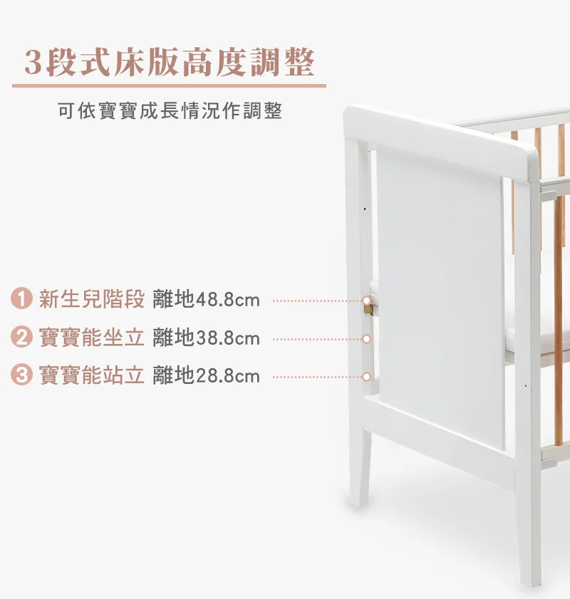 7. 當嬰兒能抓住站立時,床板最上端至上橫桿之高度須調整至少60公分以上。