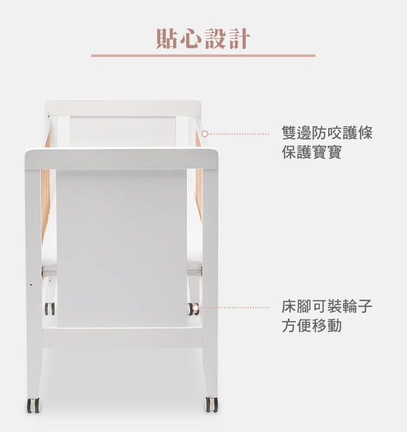 ● 雙邊防咬護條,床腳可加裝輪子,方便移動。