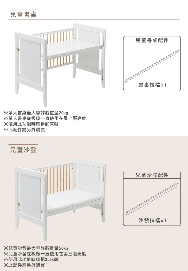 ● 欄杆式透氣床板,可加購配件組當成長床、書桌或沙發使用。