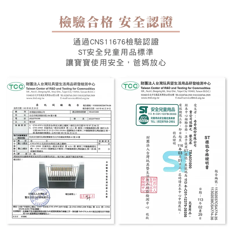 符合法規:CNS11676家用嬰兒床及折疊嬰兒床標準、ST安全兒童用品標準