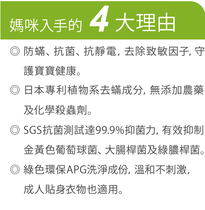 • 防蟎、抗菌、抗靜電多重去除衣物致敏因子
