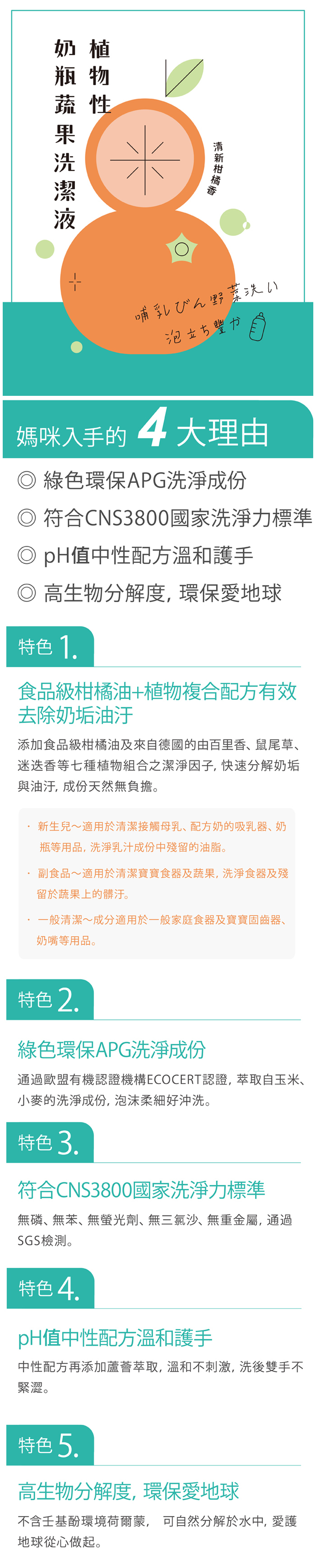 -ECOCERT與FDA 歐美雙認證 APG綠色洗淨成分,可安心用來清洗水果、蔬菜、食器與嬰兒奶瓶,奶嘴等。