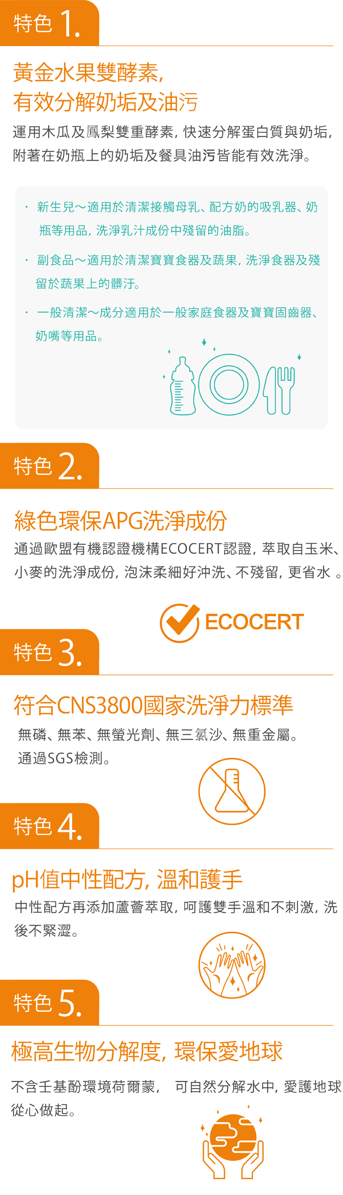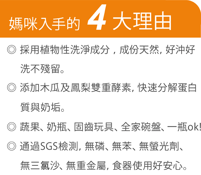 • 添加木瓜及鳯梨雙重酵素,快速分解蛋白質與奶垢,奶瓶、吸乳器、 寶寶餐具洗後不再油膩膩