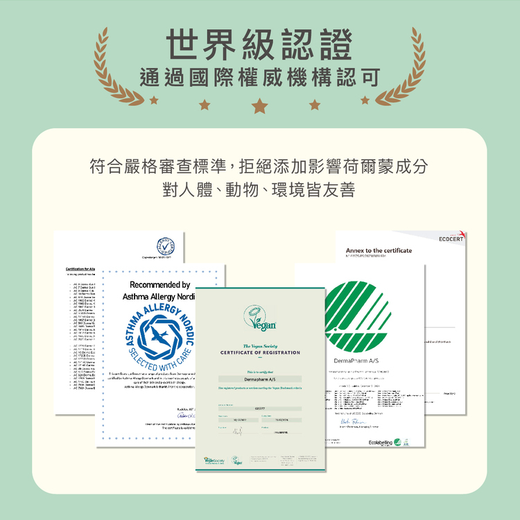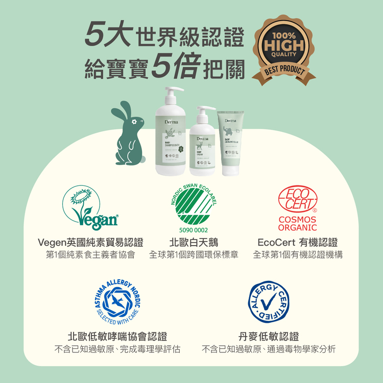 100%無香味、 人體無害及環保的寶寶洗護品,堅持使用源自天然成分,獨家保濕植萃配方,堅持給寶寶單純呵護!榮獲歐盟有機、丹麥哮喘低敏協會認證、北歐人體低害及環保認證 寶寶全身皆可使用-無Parabens、無添加酒精