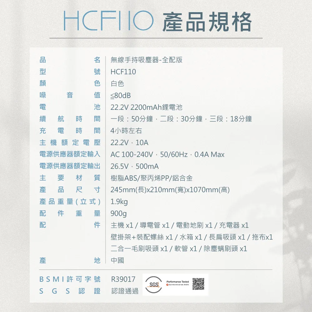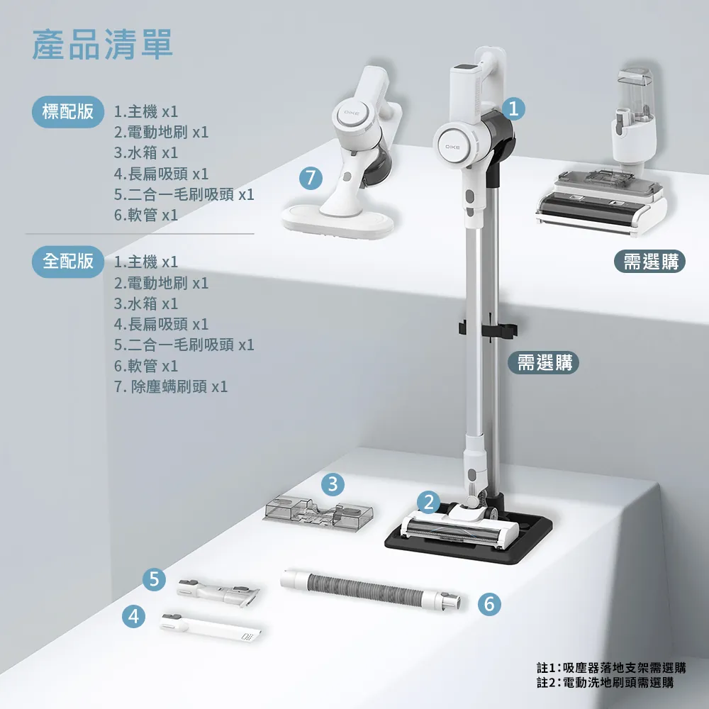 水箱x1 / 長扁吸頭x1 / 拖布x1 / 二合一毛刷吸頭x1 / 軟管x1 / 除塵蟎刷頭x1