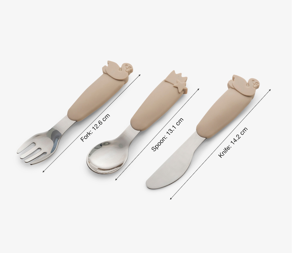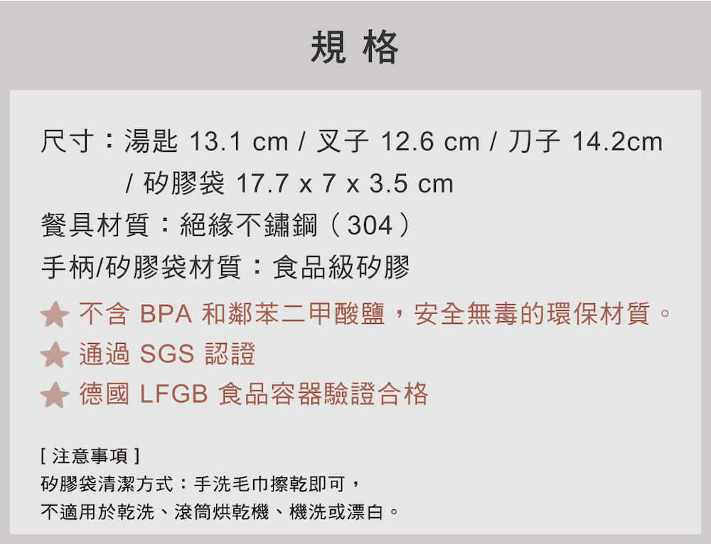尺寸:湯匙13.1cm / 叉子12.6cm / 刀子14.2cm / 矽膠袋17.7x7x3.5cm