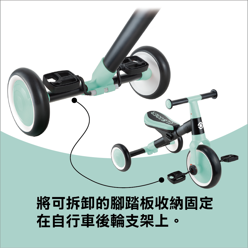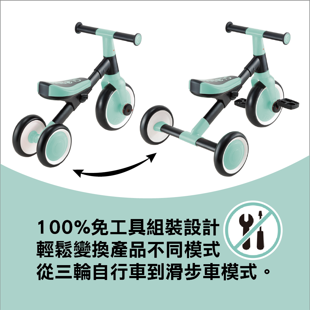 • 100%免工具組裝設計,輕鬆變換不同模式從三輪車到滑步車。
