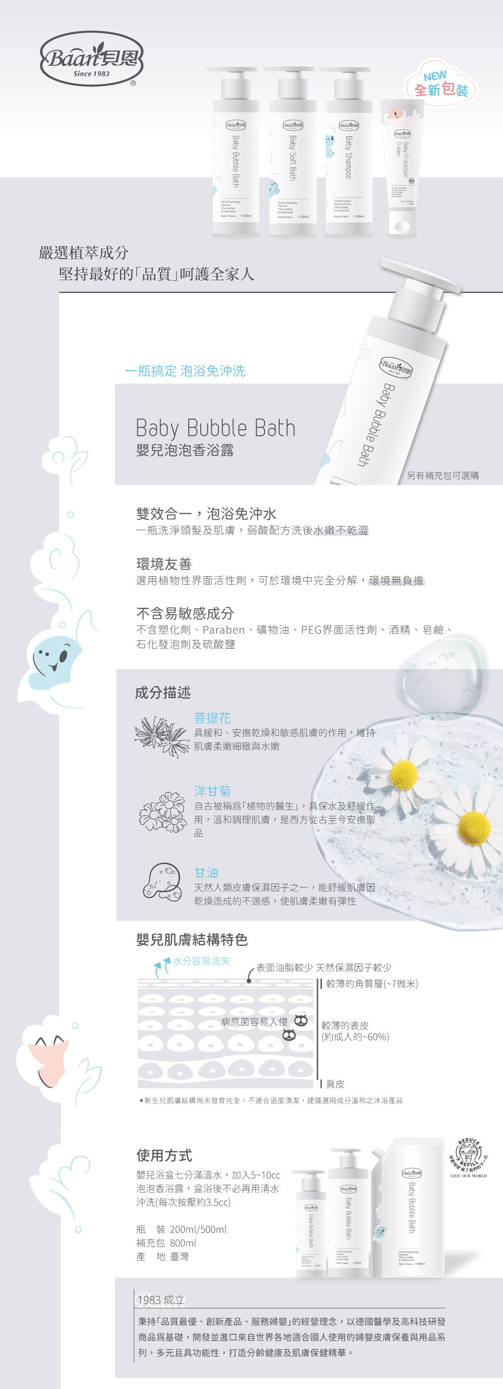 • 菩提花、洋甘菊萃取,安撫稚嫩肌,最適合新生兒肌膚清潔
