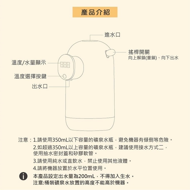 1. 請使用350mL以下容量的礦泉水瓶,避免機器有傾倒等危險
