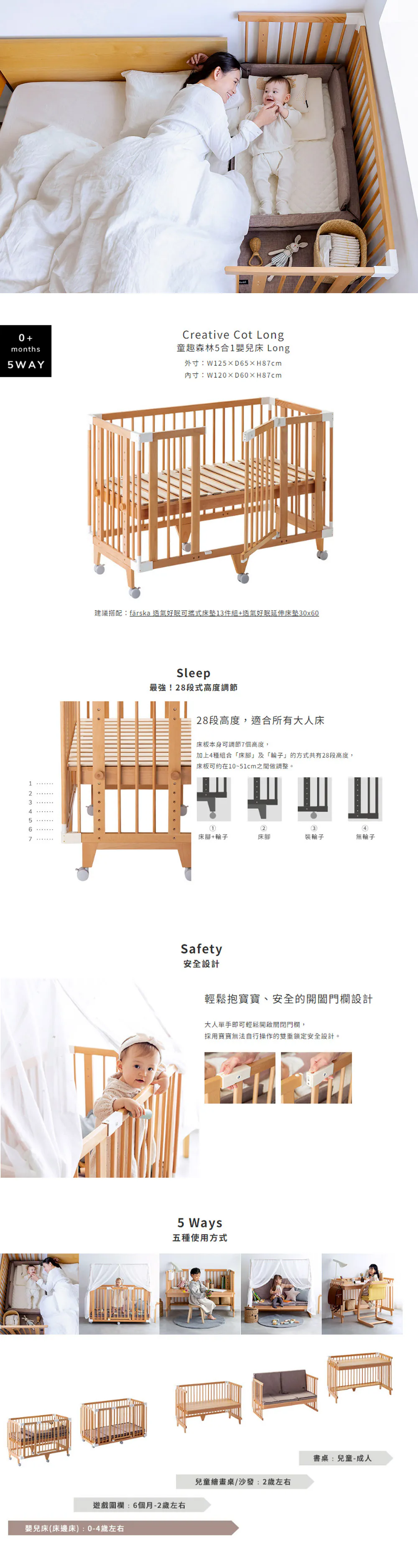 - 28 段式調節高度,隨時側身照護寶寶