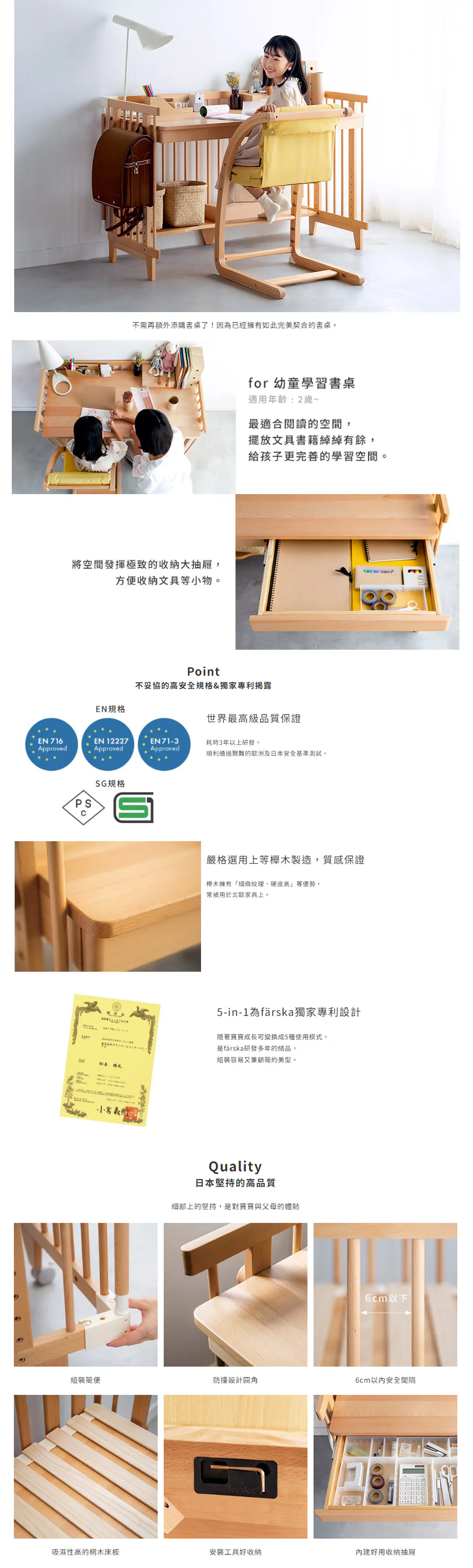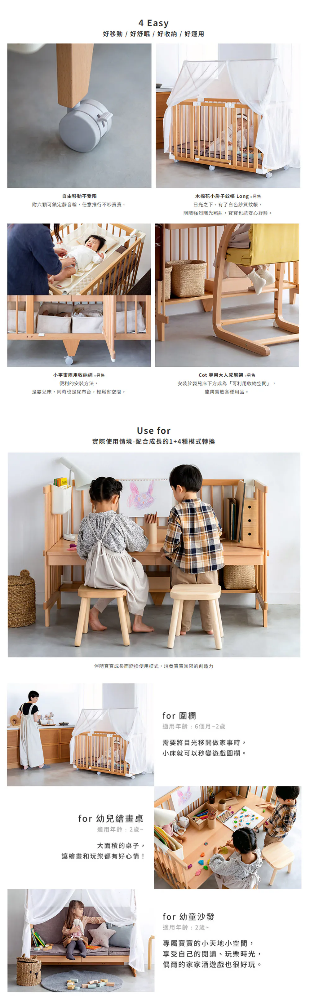 - 1+4 種旗艦版使用方式,嬰兒床、圍欄、兒童繪畫桌、沙發、成人書桌,變化無需另購配件,隨貨全配到好