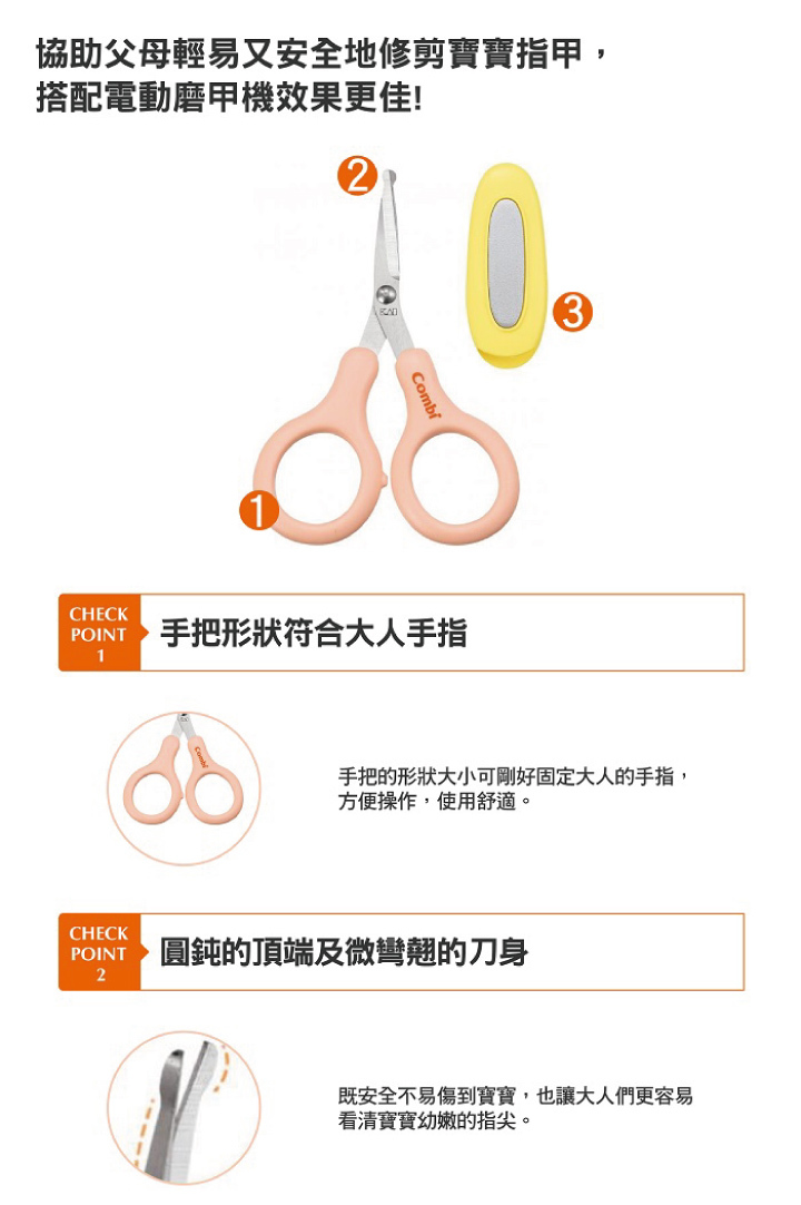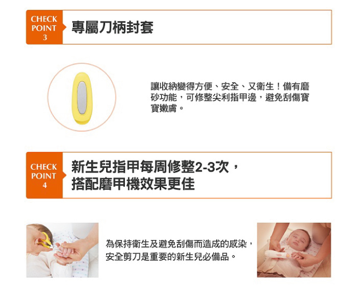 • 新生兒指甲平均每周必須修整2-3次,為保持衛生及避免刮傷而造成的感染,安全剪刀是重要的新生兒必備品