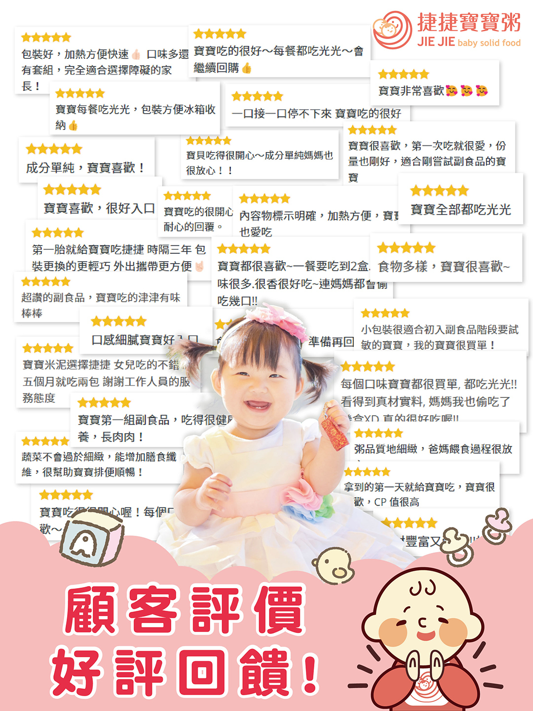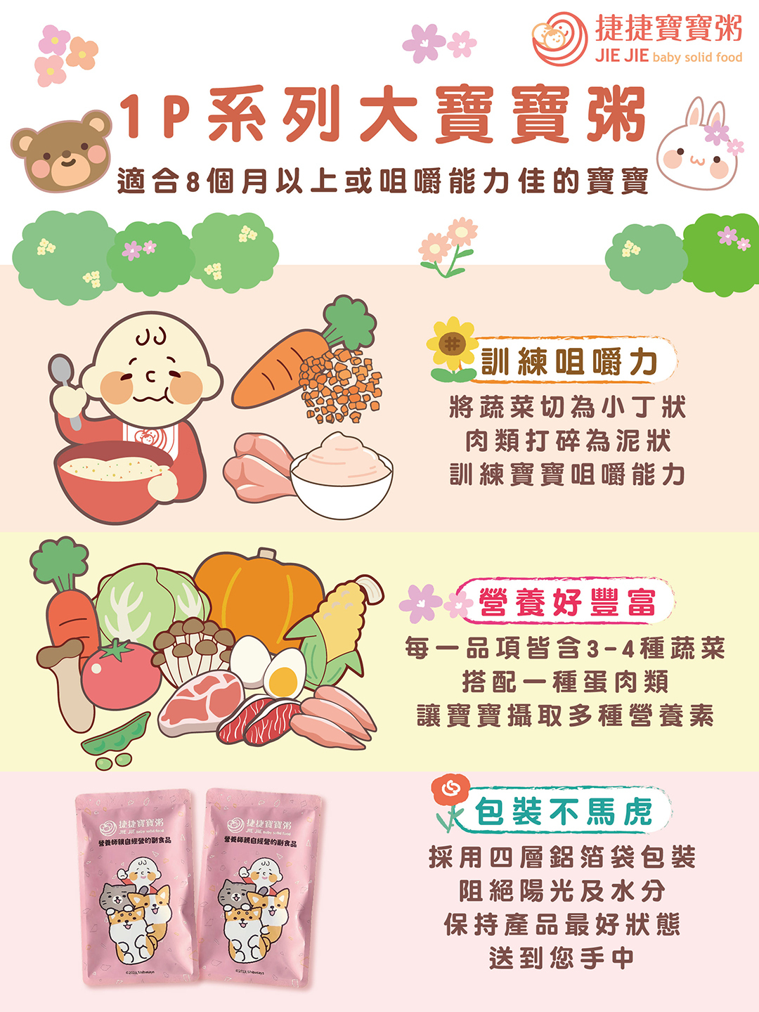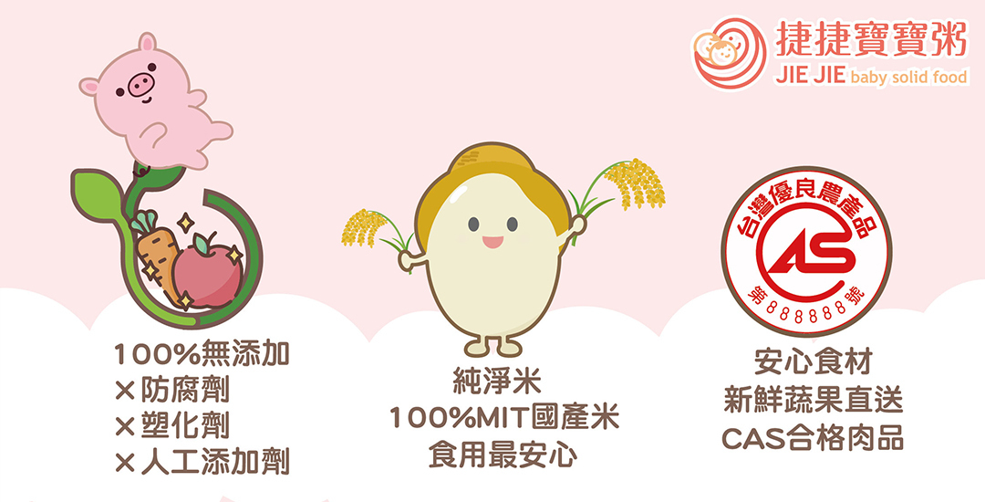 捷捷寶寶粥全系列餐點保證不添加防腐劑與任何人工食品添加物,請家長安心選購!