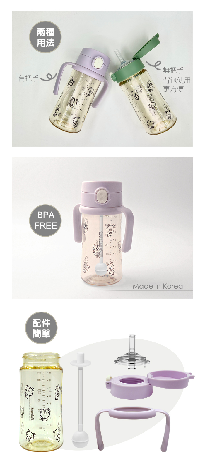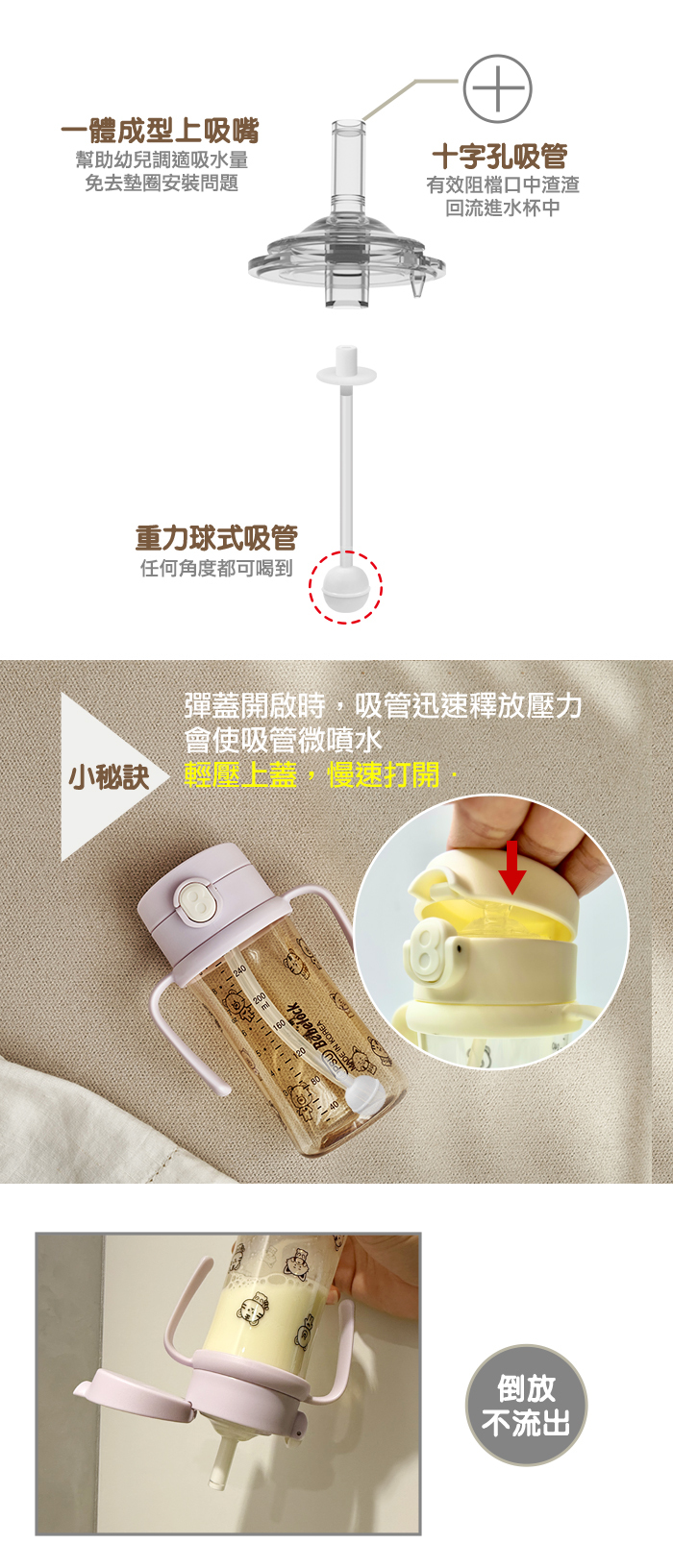 • 一體成形上吸嘴設計,易清洗,幫助幼兒調適吸水量,並免去墊圈配件安裝問題。