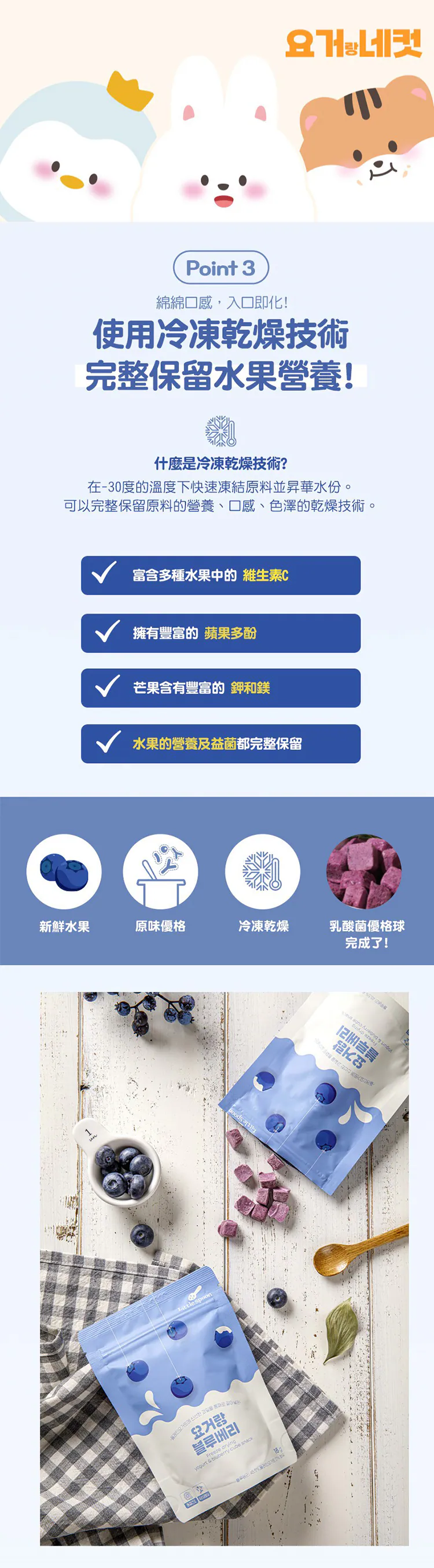 藍莓-藍莓,原味優格(生乳,寡糖,糖,果膠,乳酸菌),糊精(玉米澱粉),蔗糖(甘蔗100%) *乳酸菌:嗜熱鏈球菌/乳酸桿菌/乳雙歧桿菌*