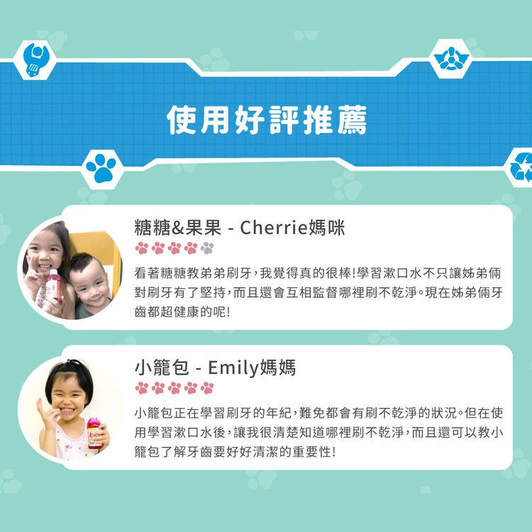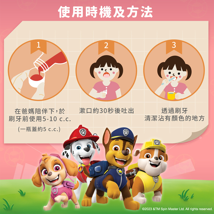 需在大人陪伴下於刷牙前使用,用量為5-10c.c.(倒至瓶蓋處) 不需加水稀釋,於漱口後30秒後吐出,清潔有顏色的地方