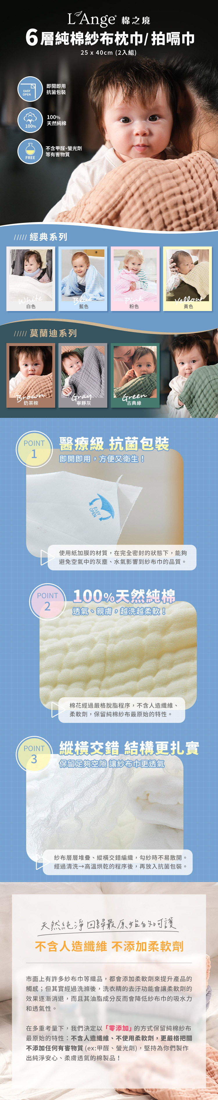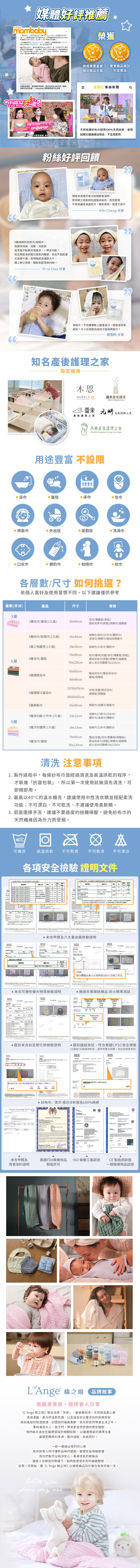 層層把關每一道製作過程,提供最高品質的產品。商品經過清洗及高溫烘乾再放入「抗菌包裝」,即開即用不用另外清洗,感受最天然與純淨的觸感!