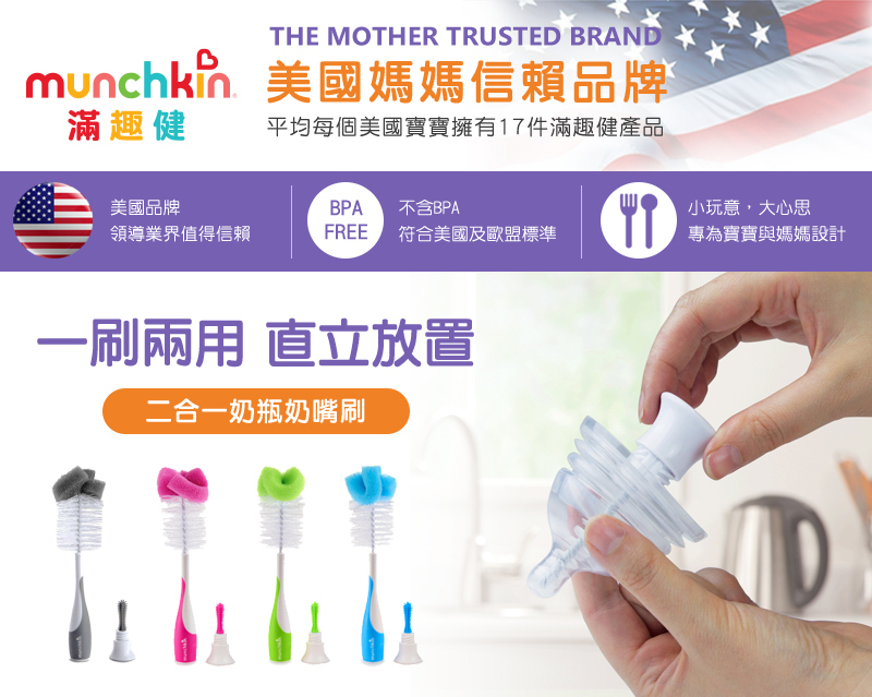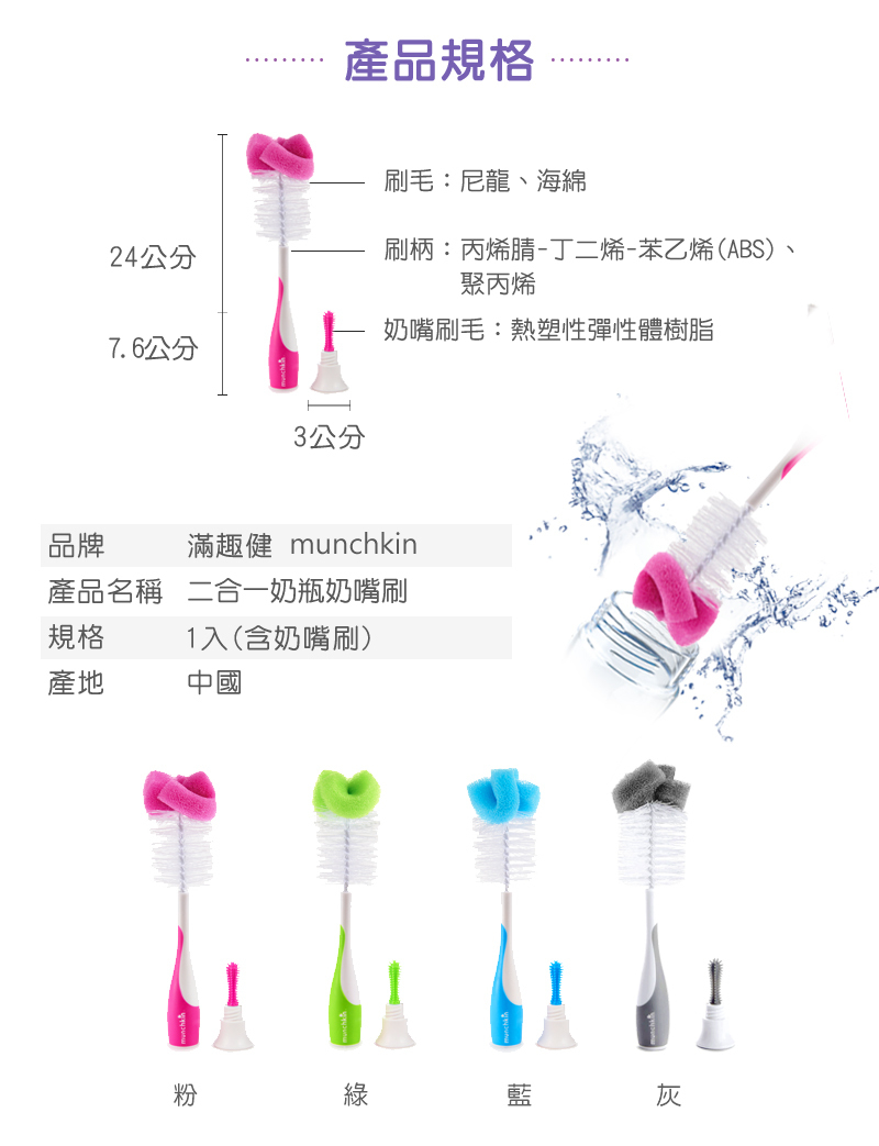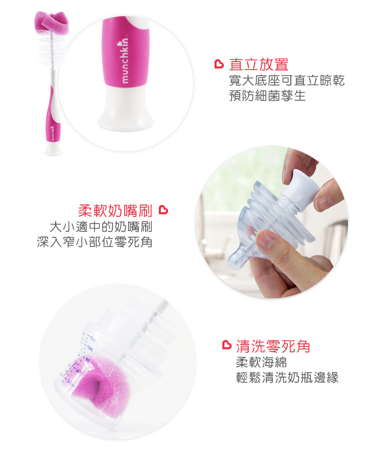 -奶瓶刷及奶嘴刷皆可直立放置,迅速晾乾,遠離細菌孳生。