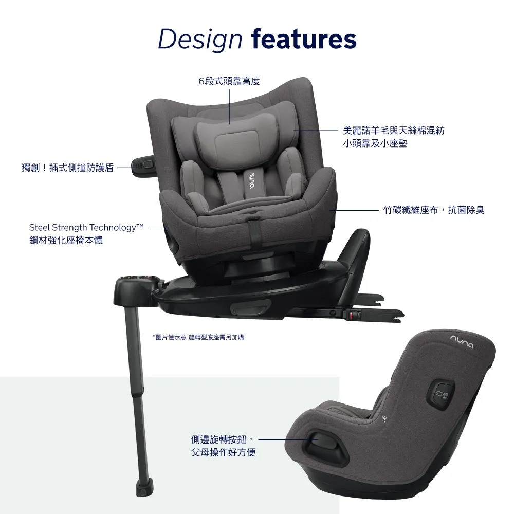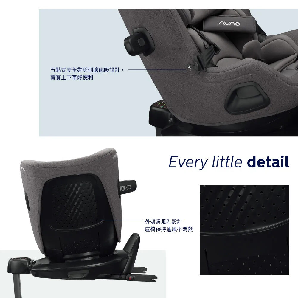 • Nuna專利 Tailor tech™記憶泡棉技術搭配EPP能量吸收泡棉,以及可拆式新生兒小座墊及小頭靠,讓側撞功能再升級