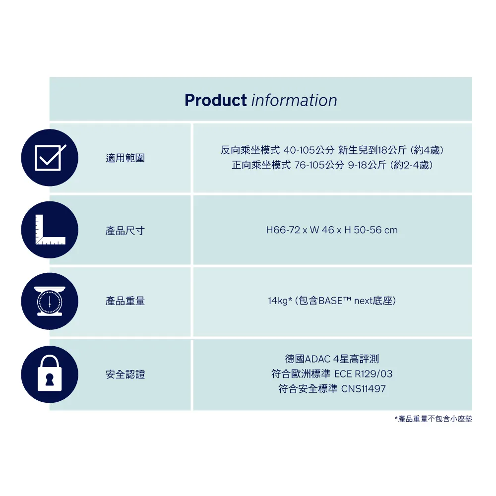 -通過最嚴謹的i-Size 認證,承載兒童更放心。反向適用於新生兒-105cm,正向適用於76-105cm的寶貝。
