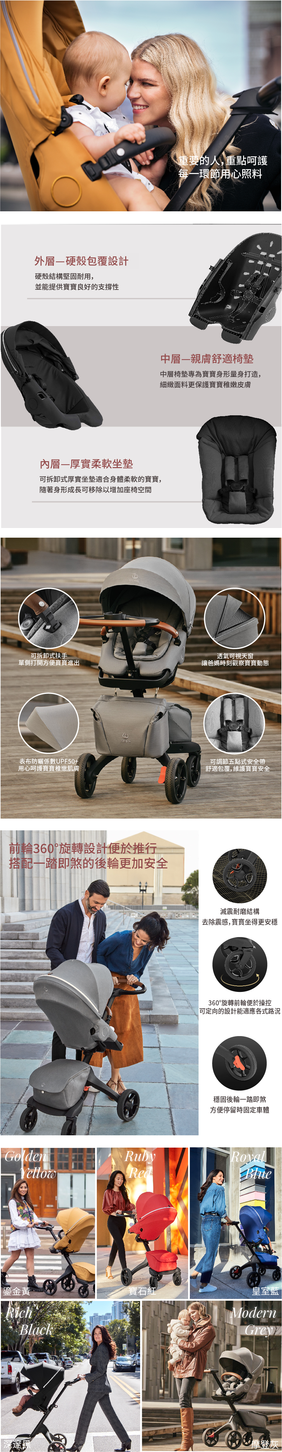 業界唯一單桿設計,流線型的車體搭配質感色彩及面料體現優雅品味,並設計可調節式的座椅高度、傾斜度、面朝方向及踏板位置,貼心為寶貝每一階段的身心需求著想,是每一位希望兼顧寶寶舒適、安全性、品質與時尚的父母都喜愛的育兒單品。