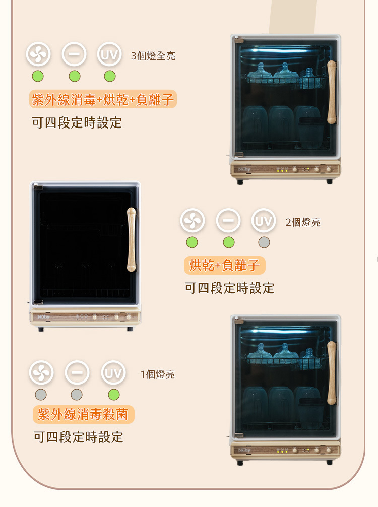 多重功能模式: 紫外線消毒、負離子除臭+中溫暖風烘乾