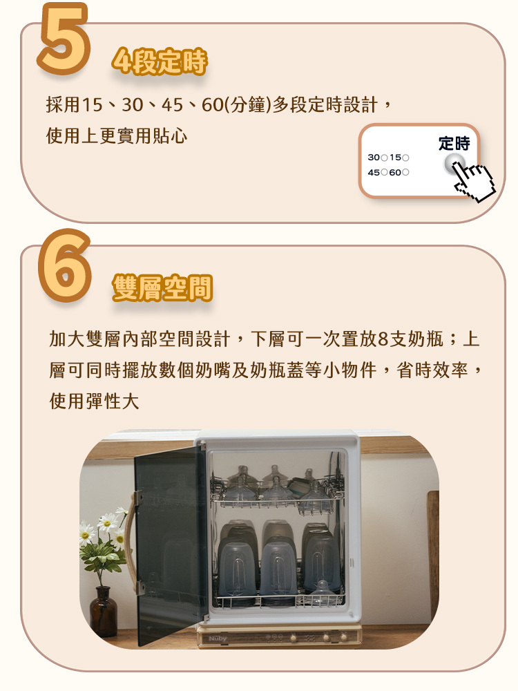 加大雙層空間:下層可一次置放8支寬口奶瓶;上層可同時擺放數個奶嘴及奶瓶蓋等小物件