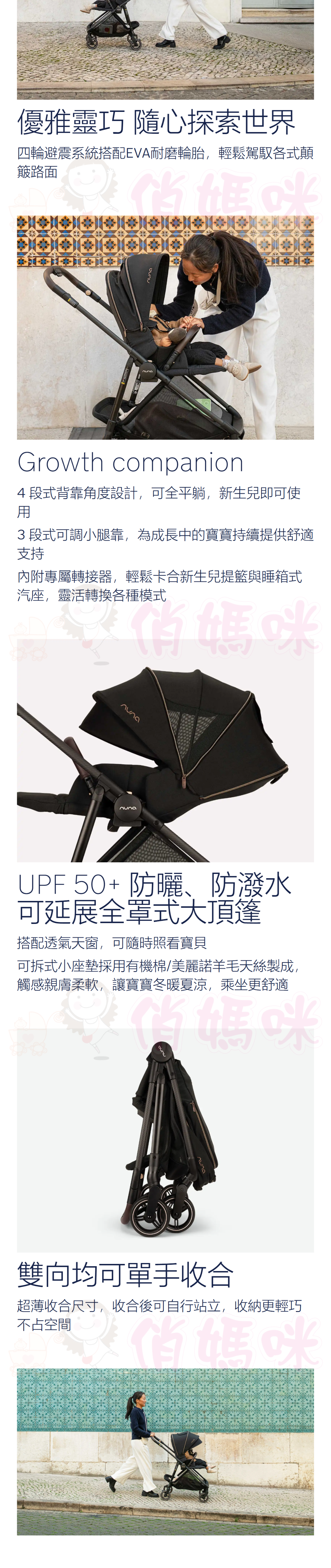 • UPF 50+ 防曬、防潑水可延展全罩式大頂篷,搭配透氣天窗,可隨時照看寶貝