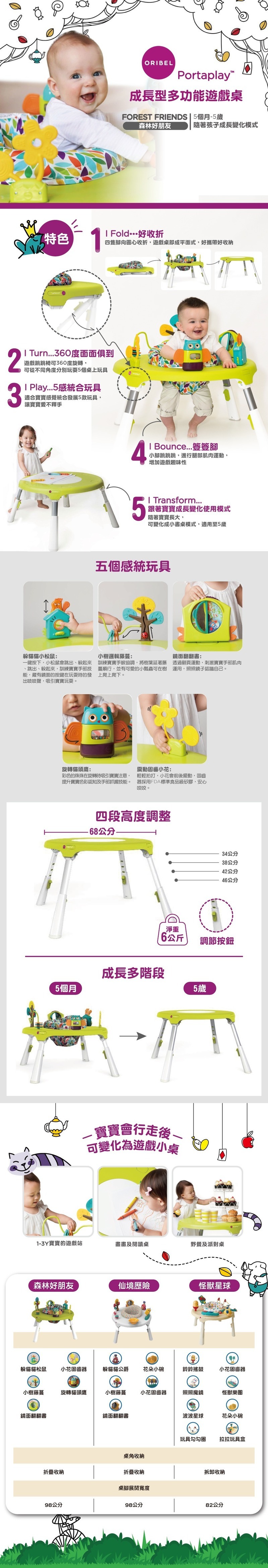 桌腳可以伸縮,可以由嬰兒期(嬰兒彈彈椅)用至5歲(多用途桌面)