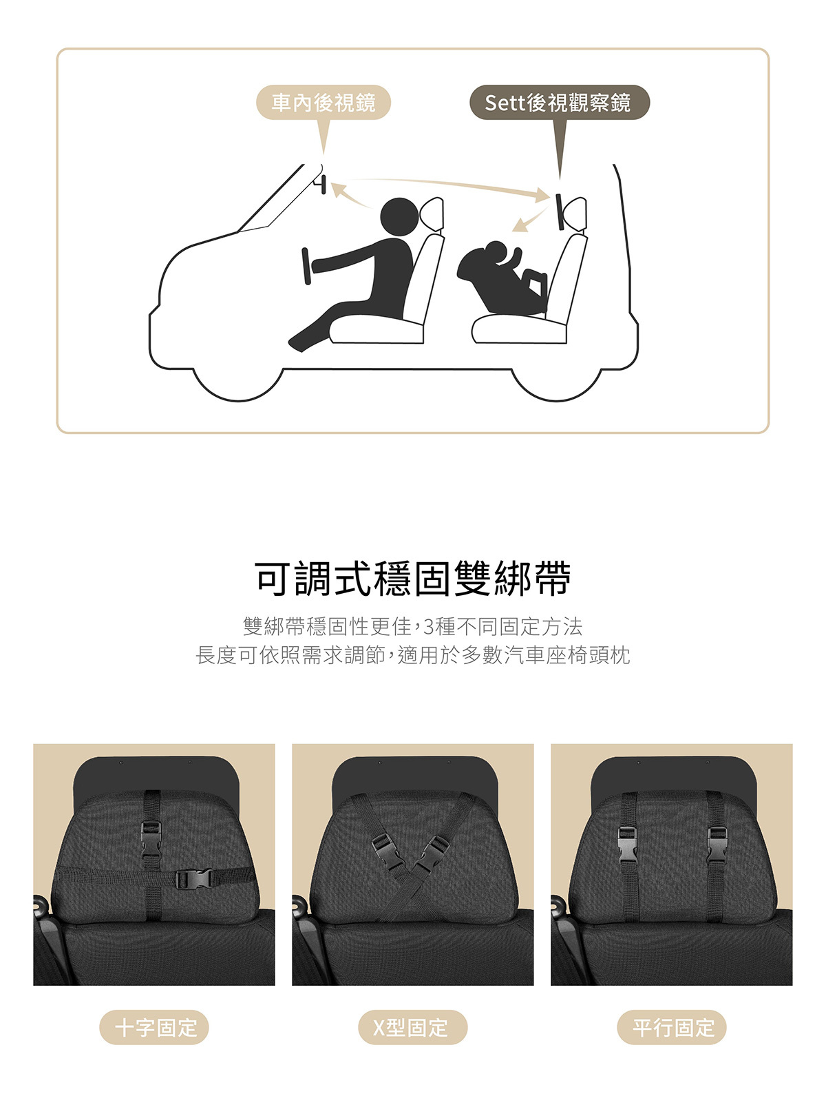 -雙綁帶穩固性更佳,3種不同綁法,適用於多數汽車座椅頭枕