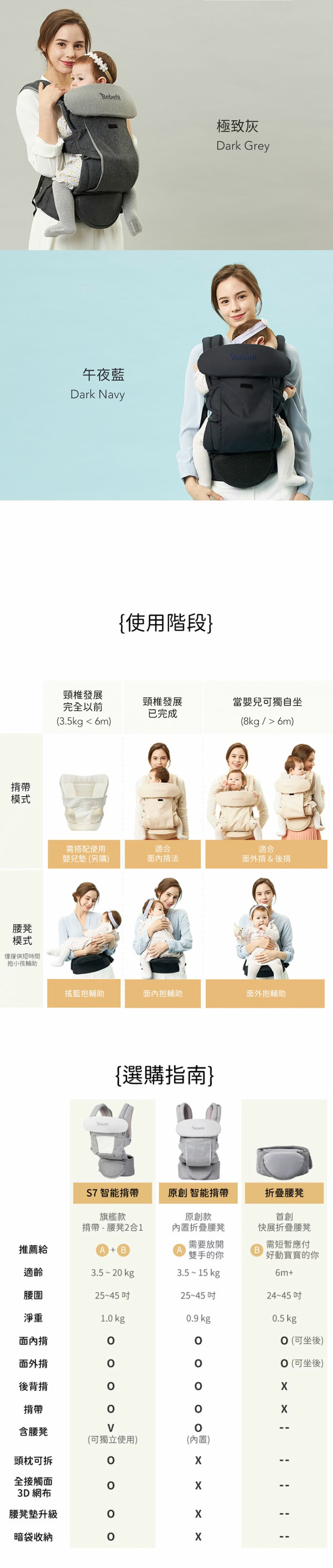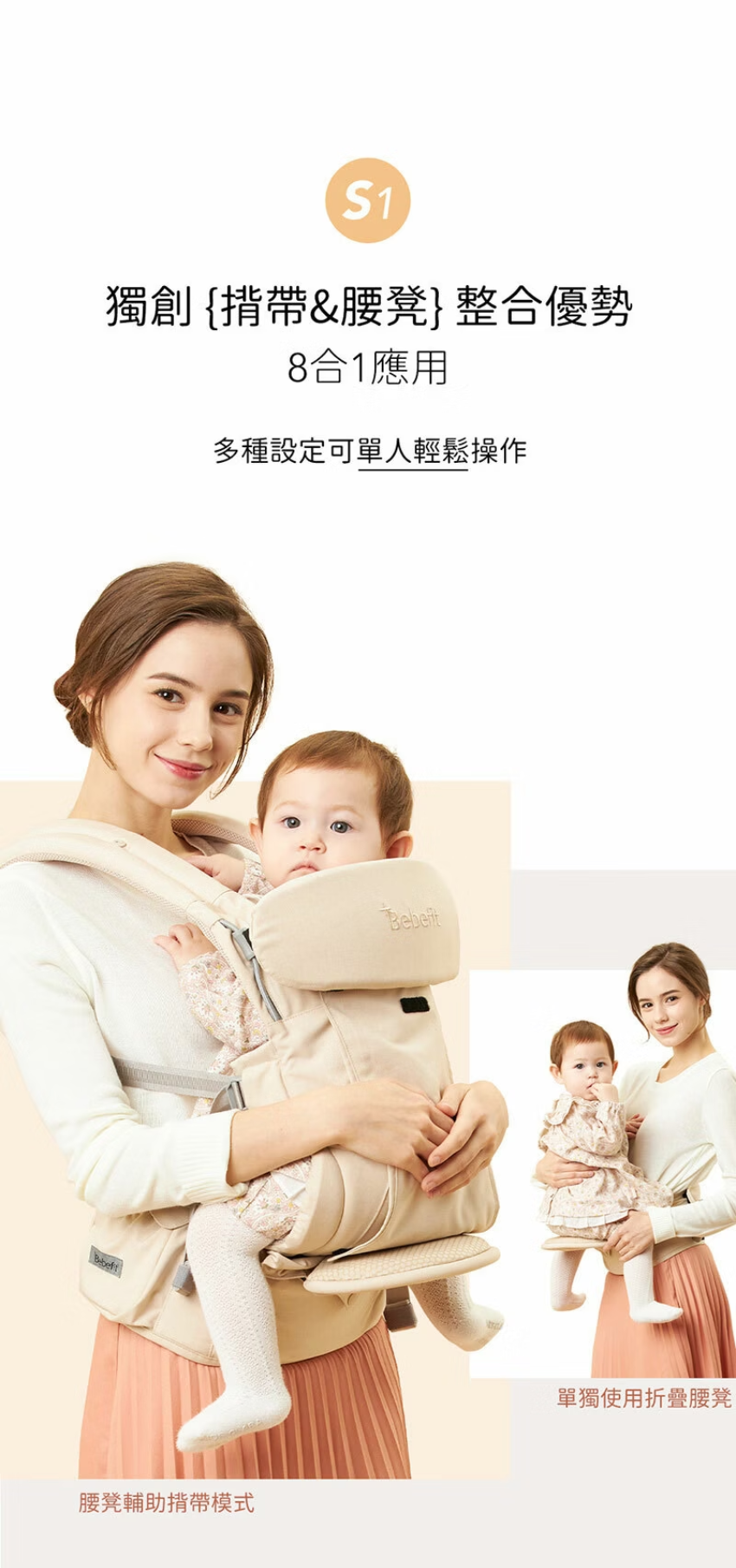 Bebefit 首創智能嬰兒揹帶,搭配內置的快展折疊腰凳, 能讓你在揹著寶寶時,依需求隨時快速的轉移重心分佈,