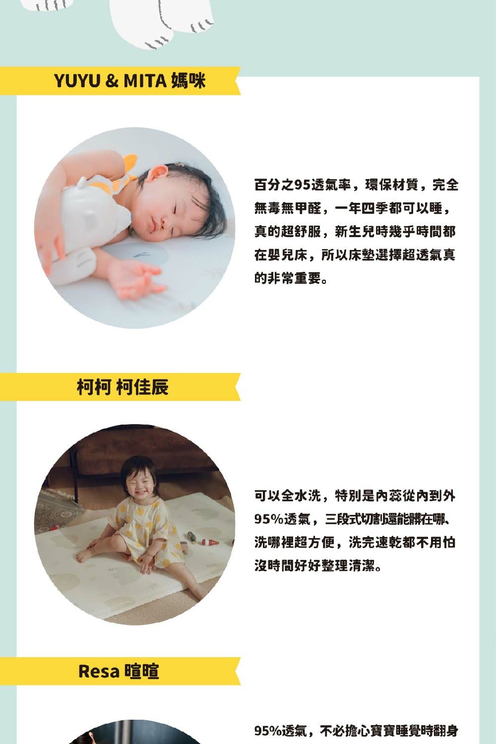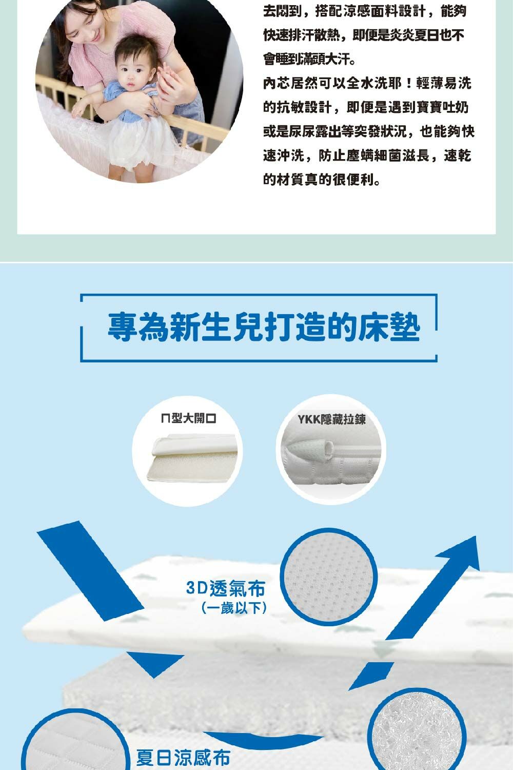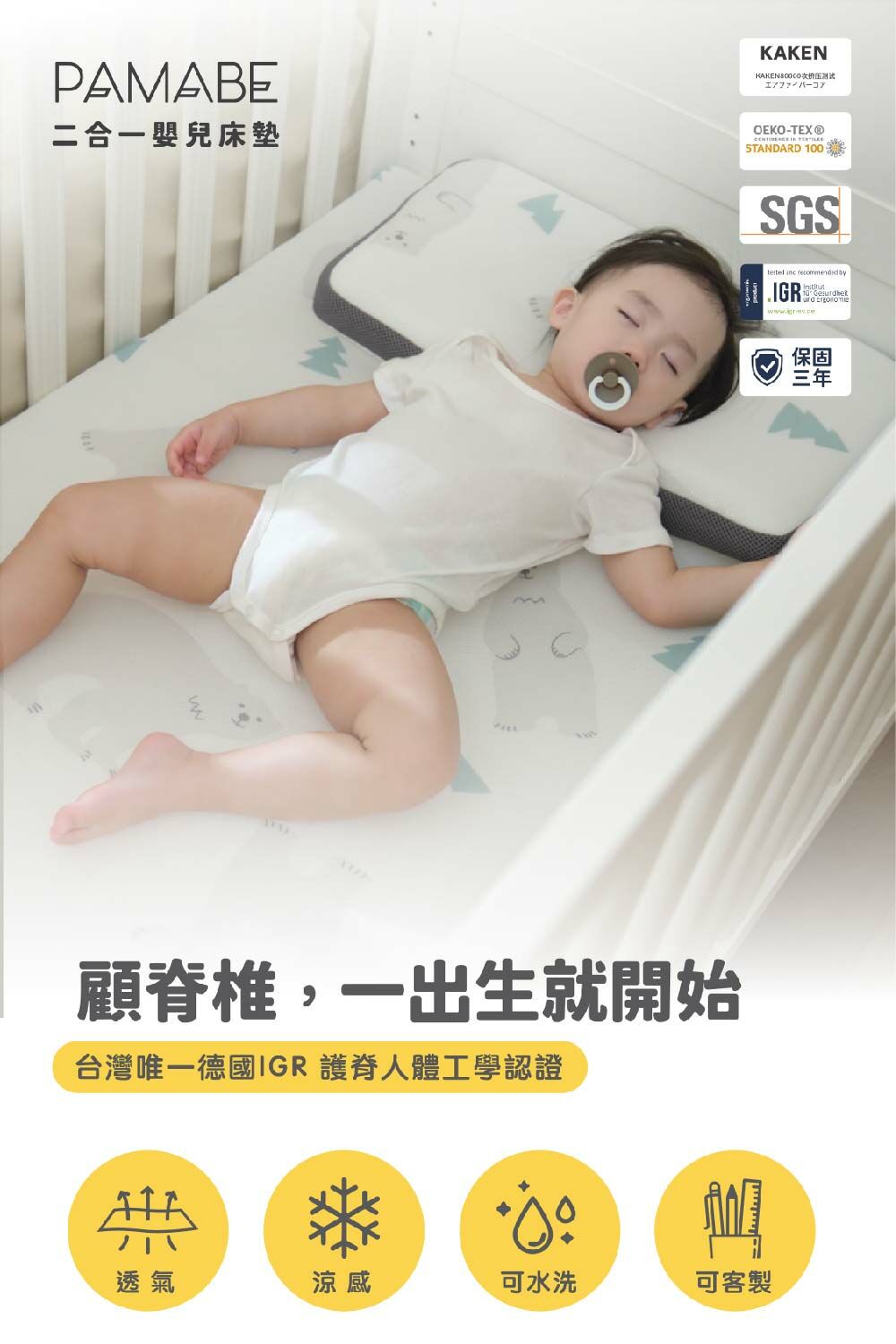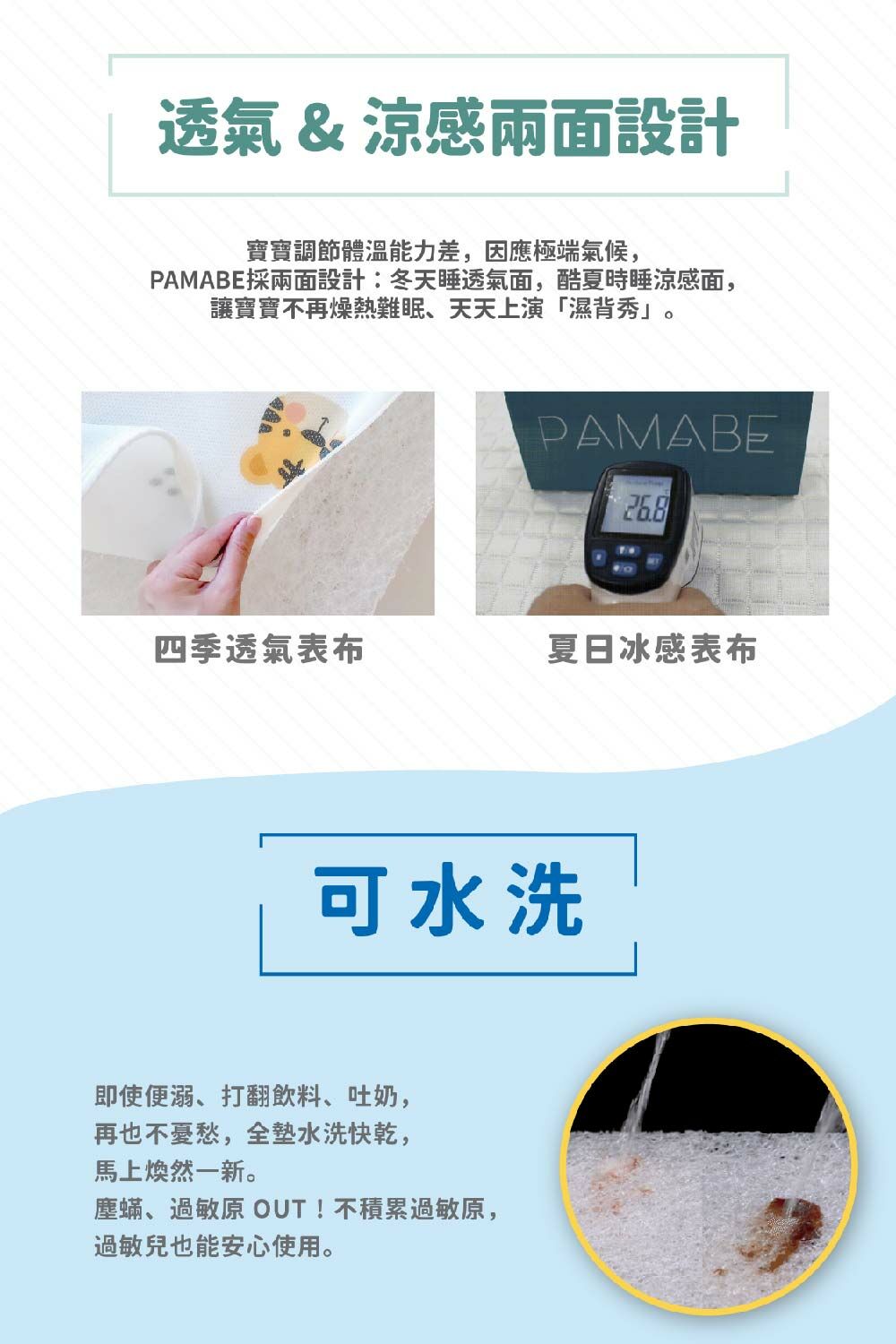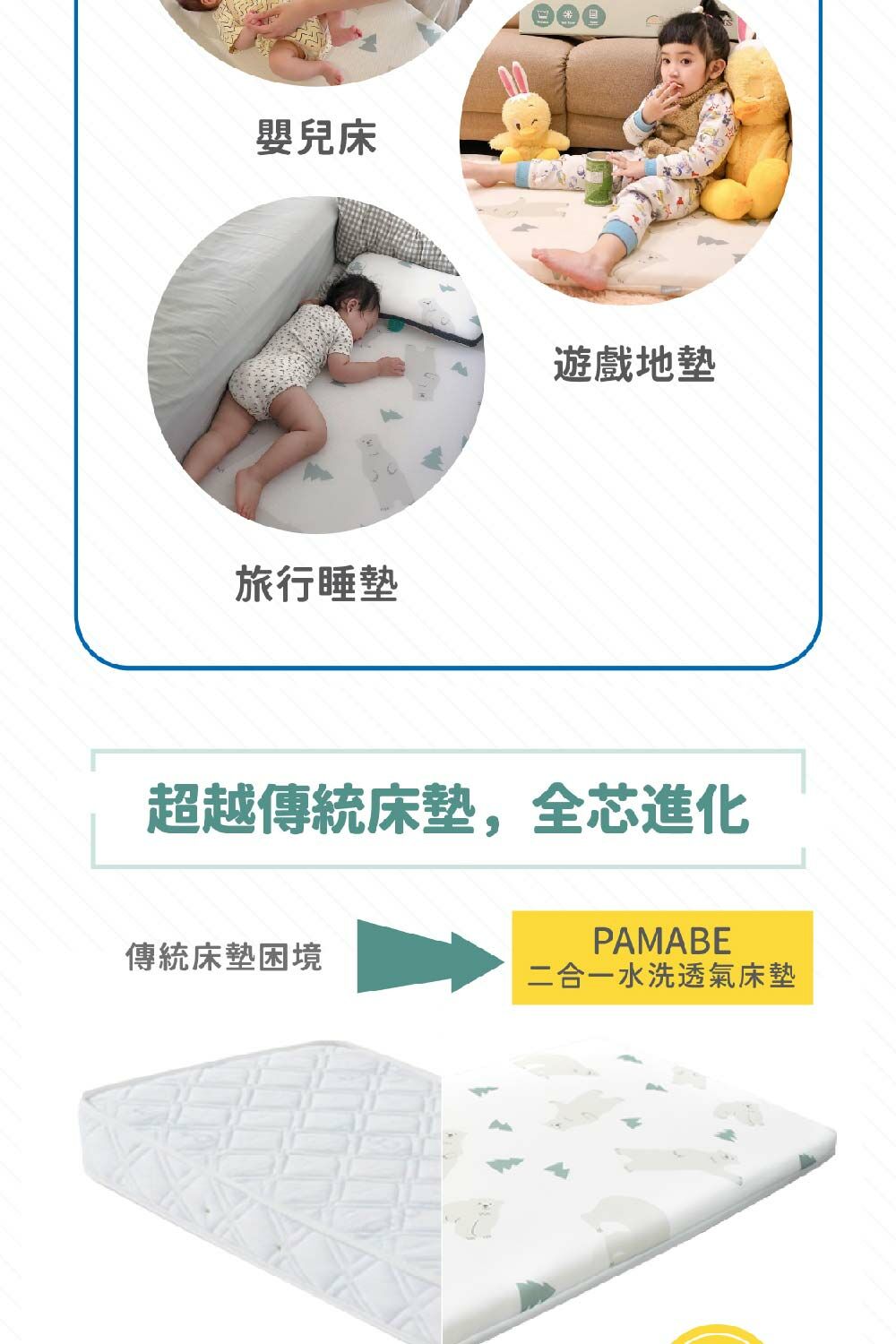 3. 1歲以下寶寶使用建議:為維護睡眠安全,可用「3D透氣鳥眼布」,且為保持《PAMABE二合一水洗透氣嬰兒床墊》原有的透氣度,無需使用保潔墊在床墊上方。