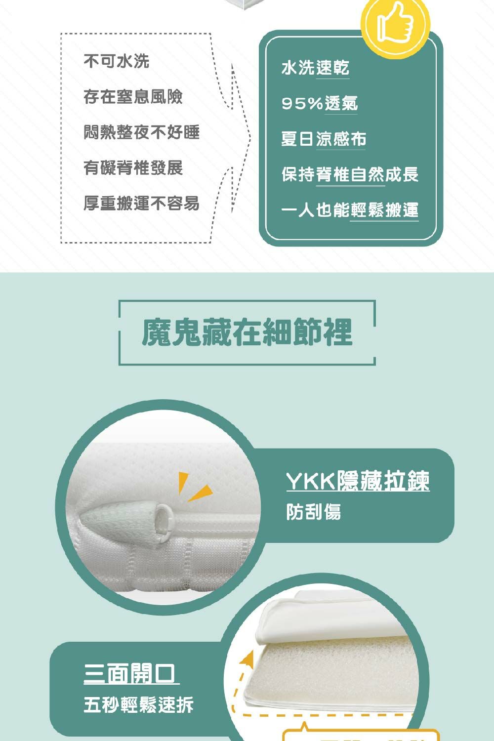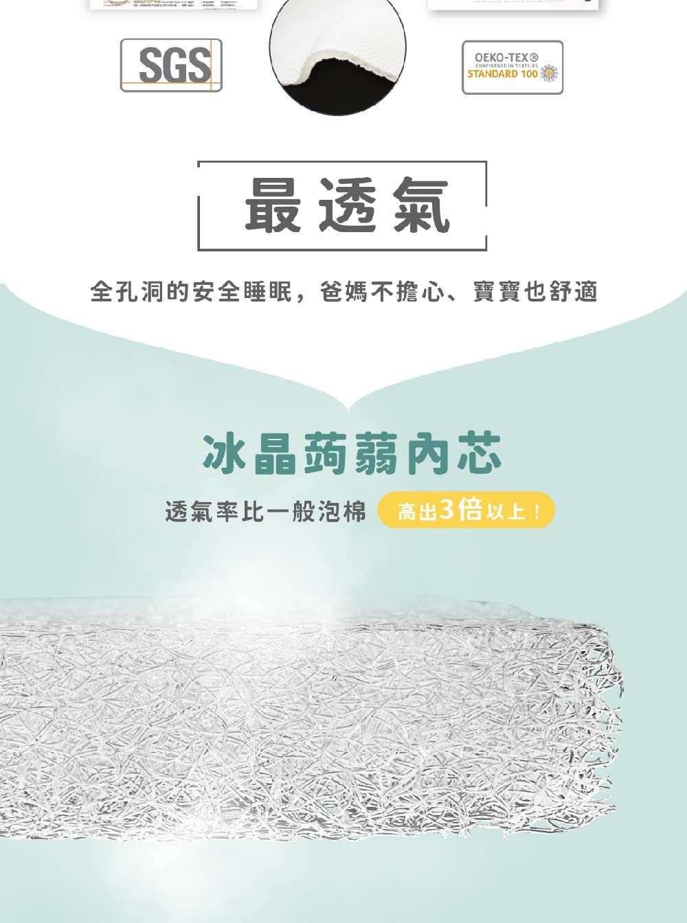 • 95%透氣率,透氣率高出泡棉3倍,安全睡眠