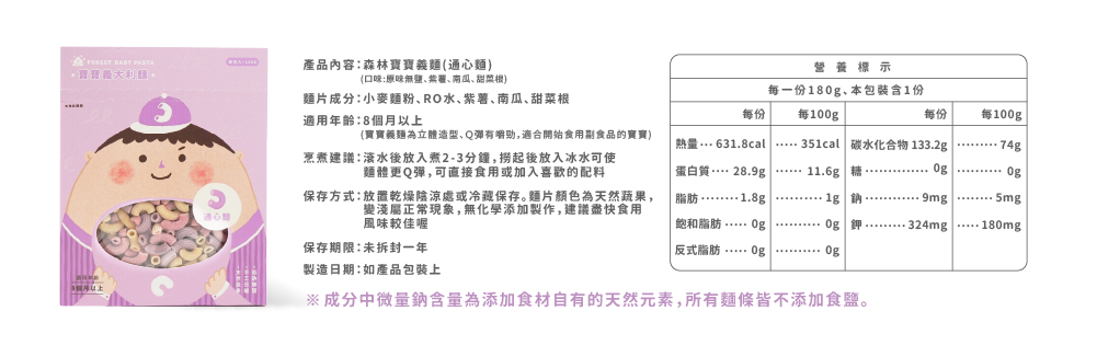 產品內容森林寶寶義麵(通心麵)(口味:原味無鹽、紫薯、南瓜、甜菜根)