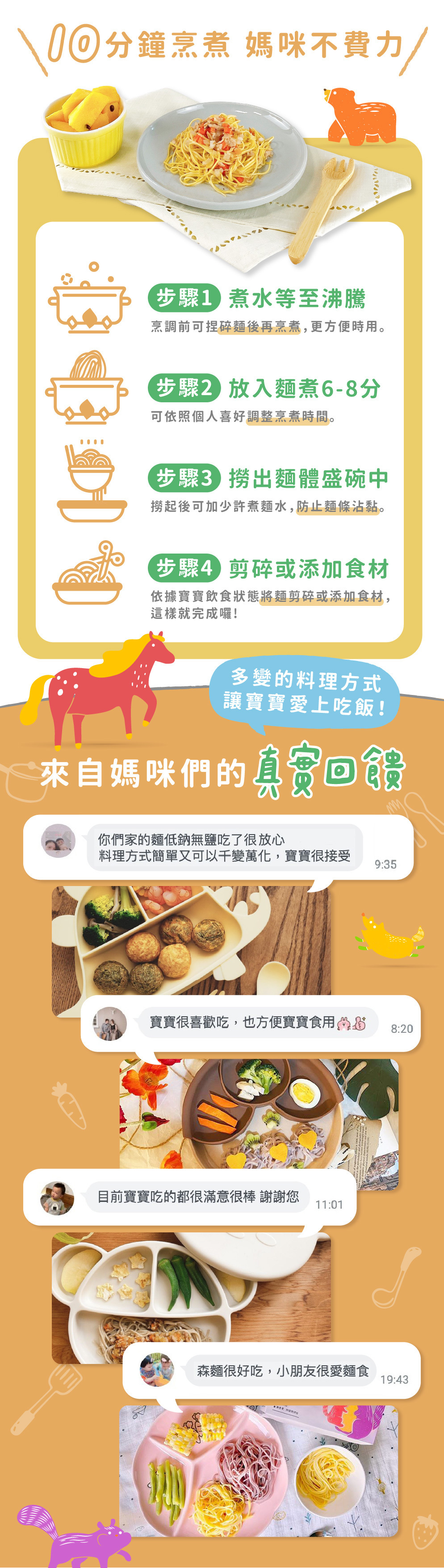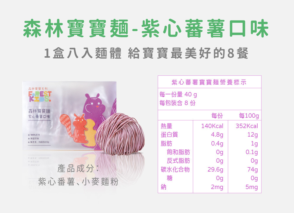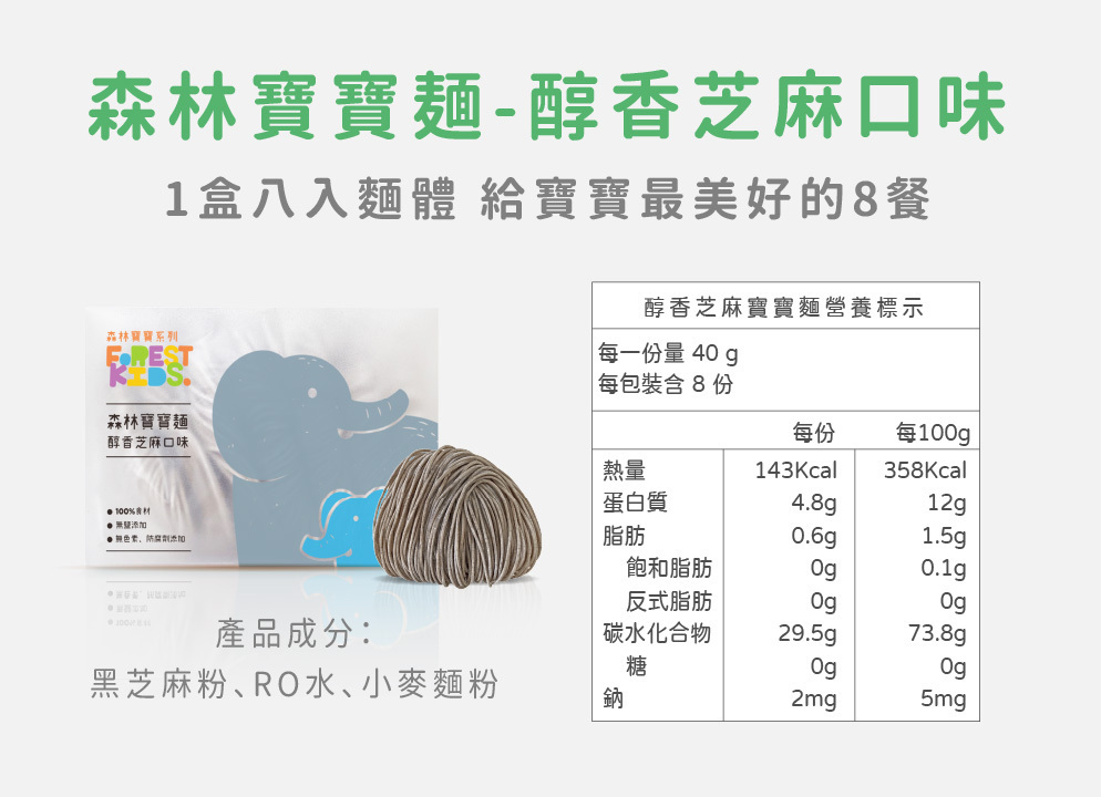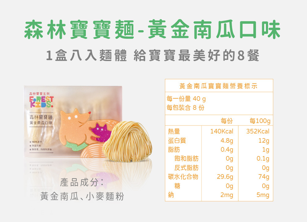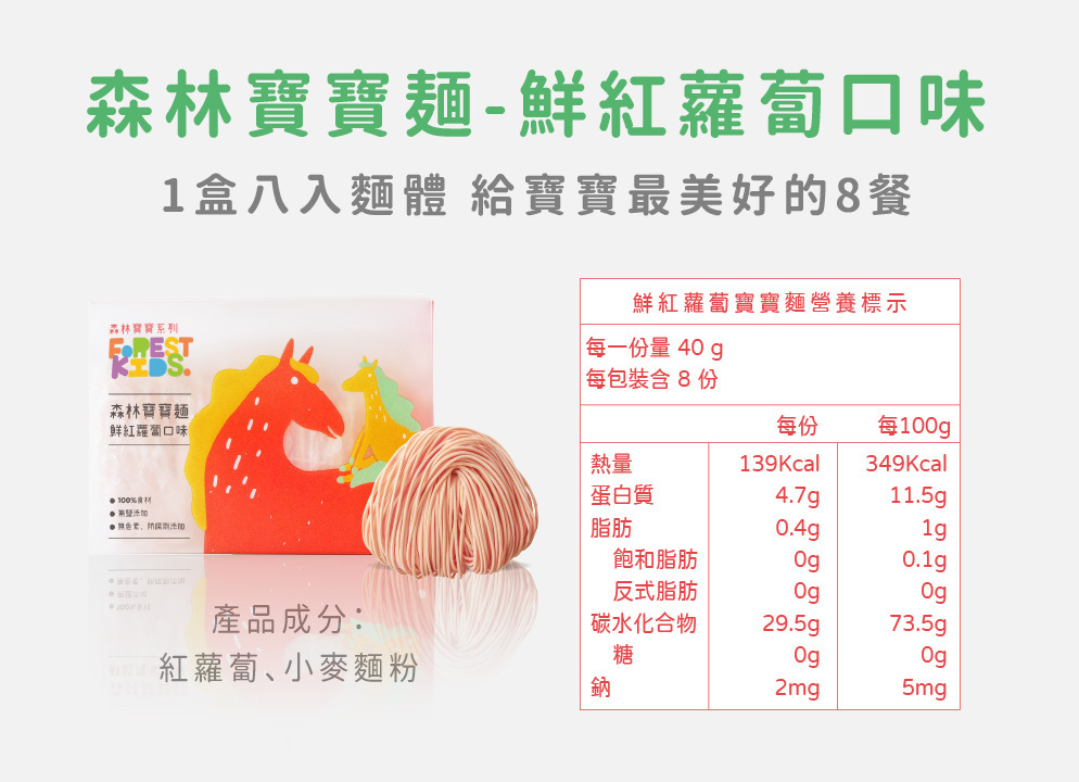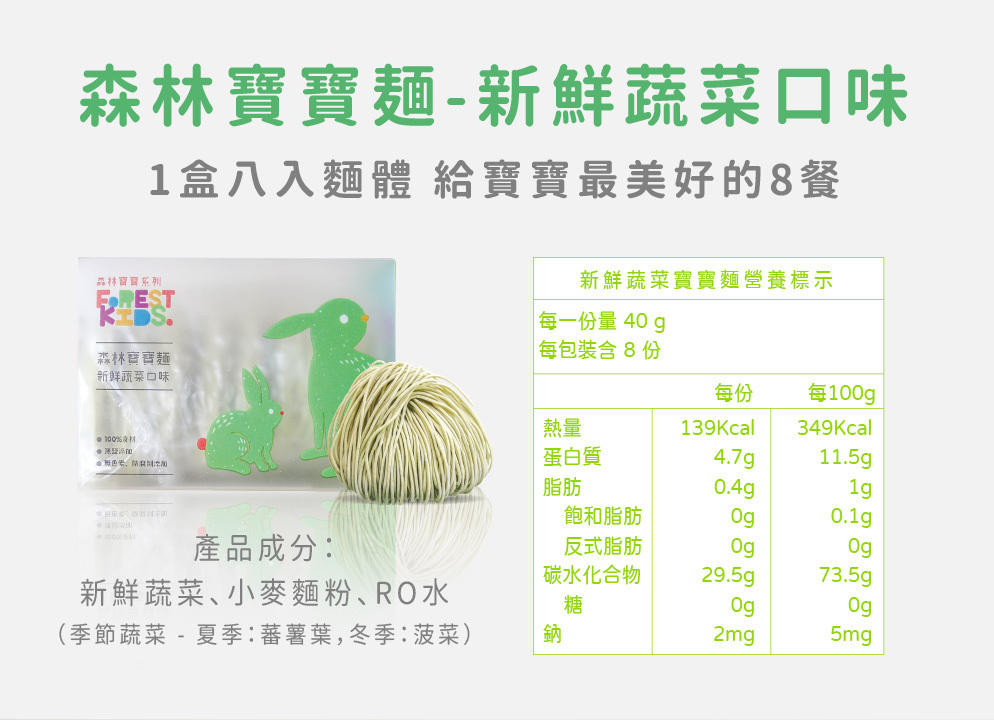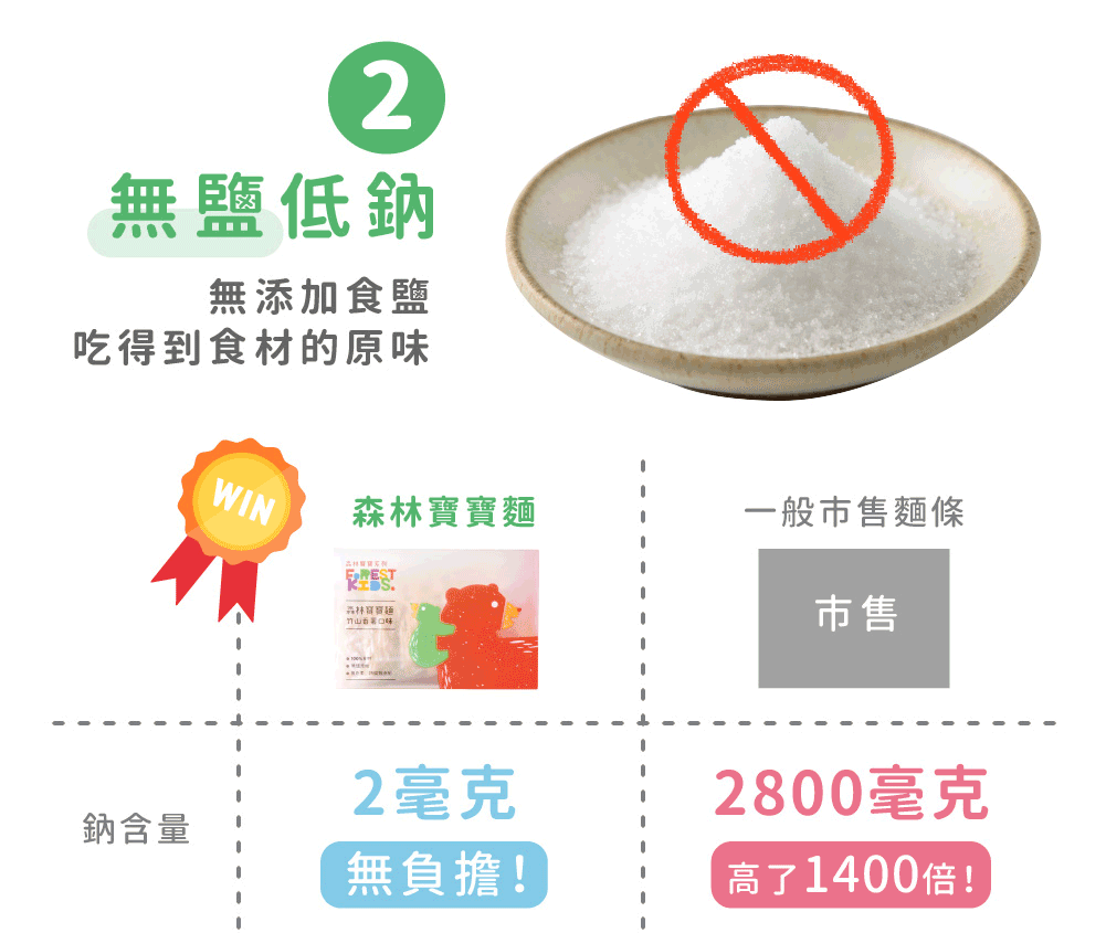 寶寶每日所需的鈉含量必須低於200毫克,而寶寶麵的鈉含量來自食材本身約只有2毫克且完全無鹽呦!