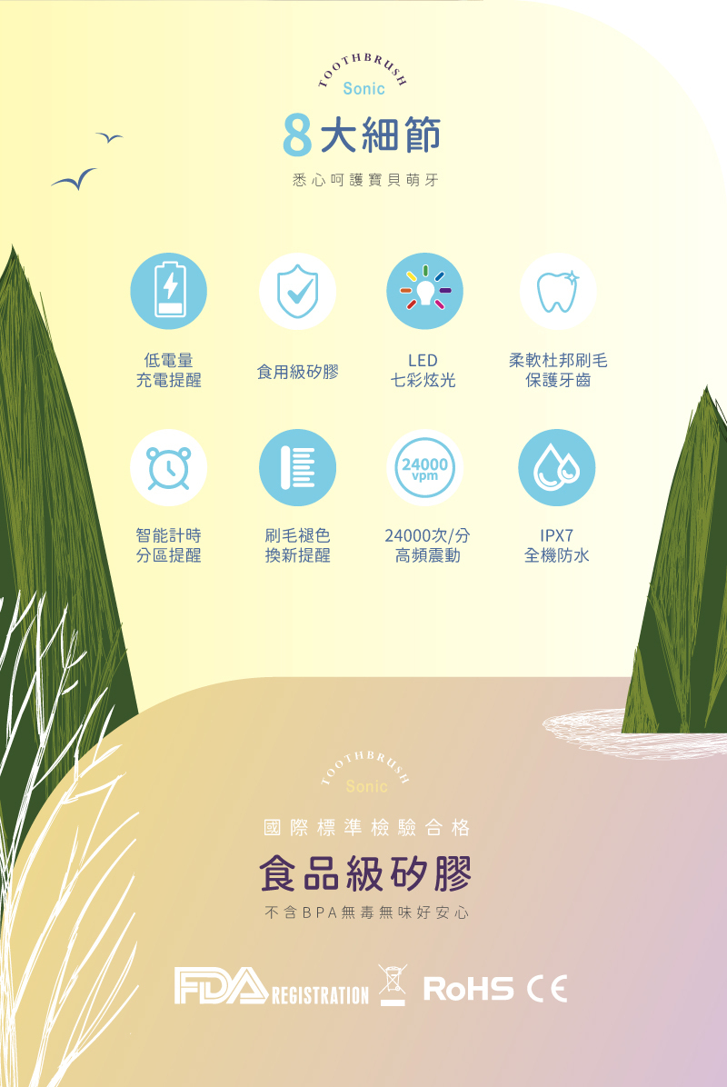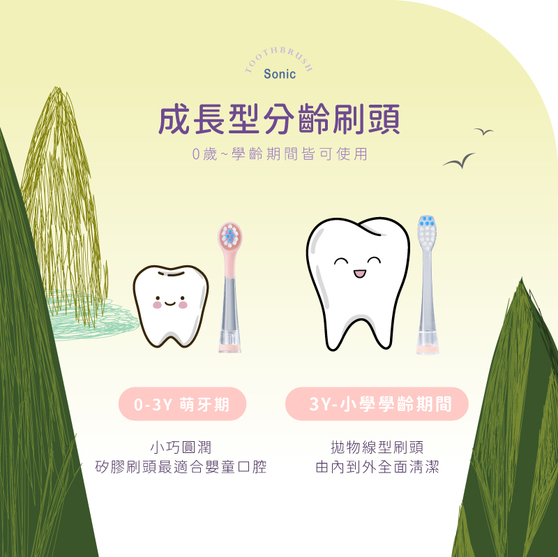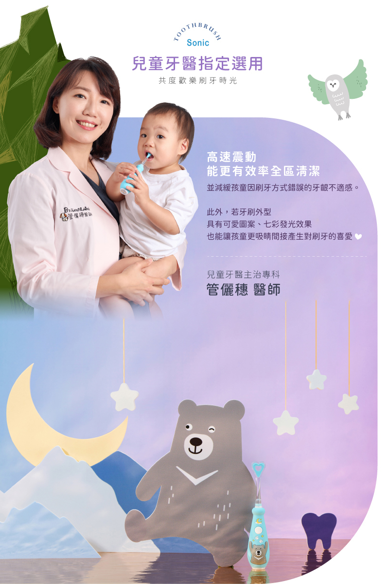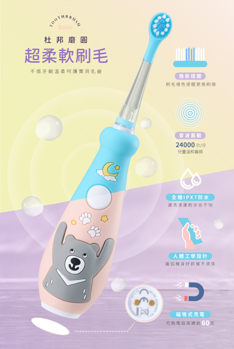 2. 此電動牙刷需由父母親陪同或輔助刷牙動作,以減少未能正確潔淨牙齒而造成蛀牙。