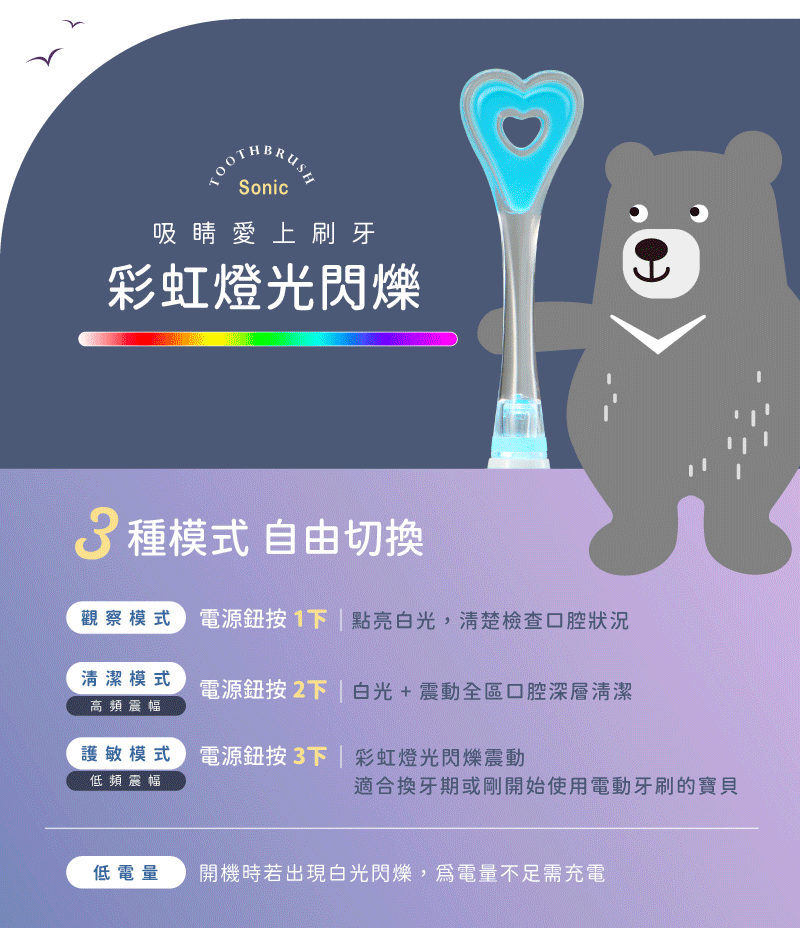 • 七彩閃爍燈光,讓寶貝吸睛愛上刷牙