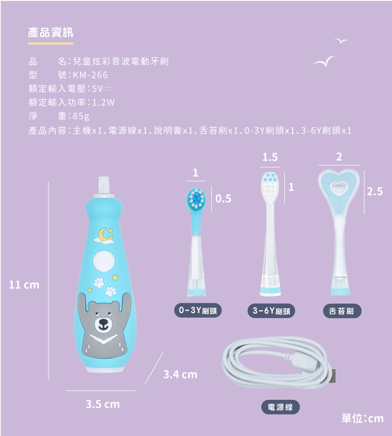 產品內容:主機x1、電源線x1、說明書x1、舌苔刷x1、0-3Y刷頭x1、3-6Y刷頭x1
