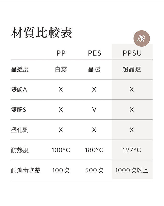 奶瓶:聚亞苯基碸(-20℃~ 197℃)