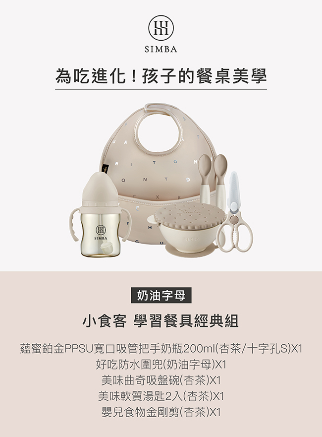 內容物:吸管把手奶瓶200ml(十字孔S號)x1+防水圍兜x1+美味曲奇吸盤碗x1+美味軟質湯匙2入組x1+嬰兒食物金剛剪x1